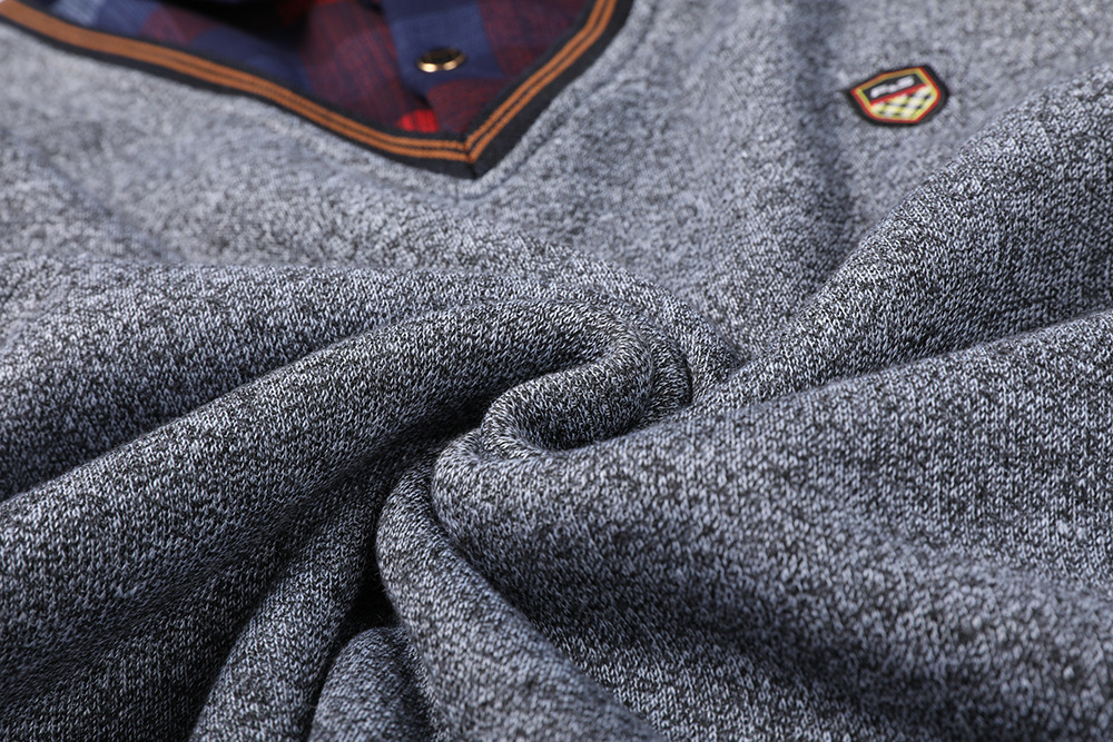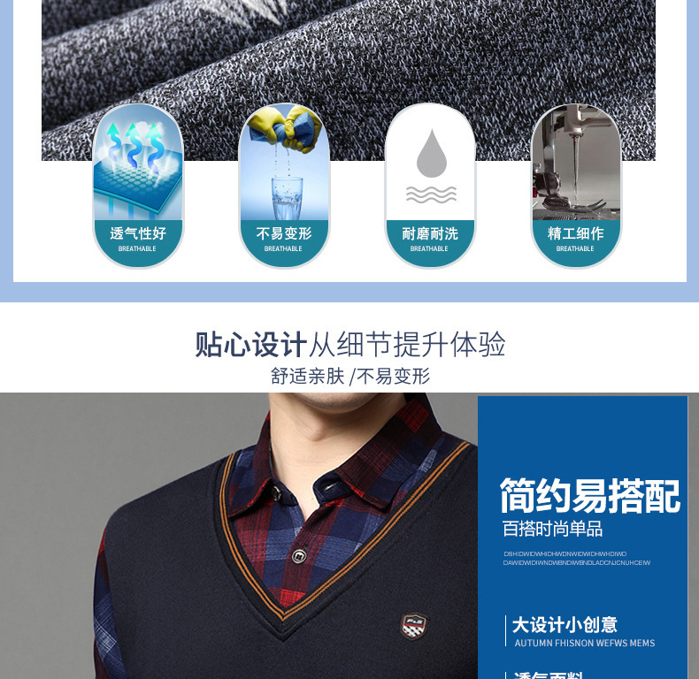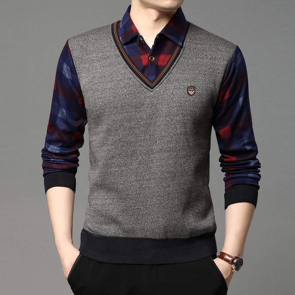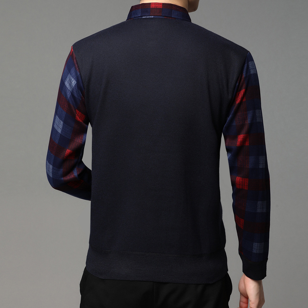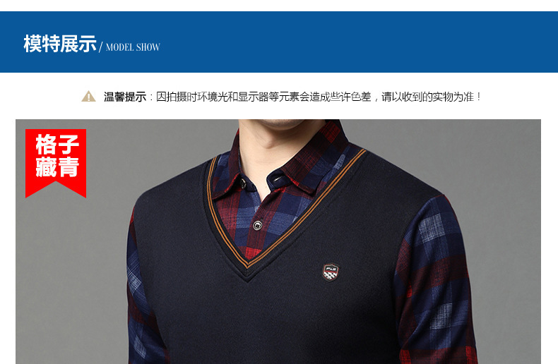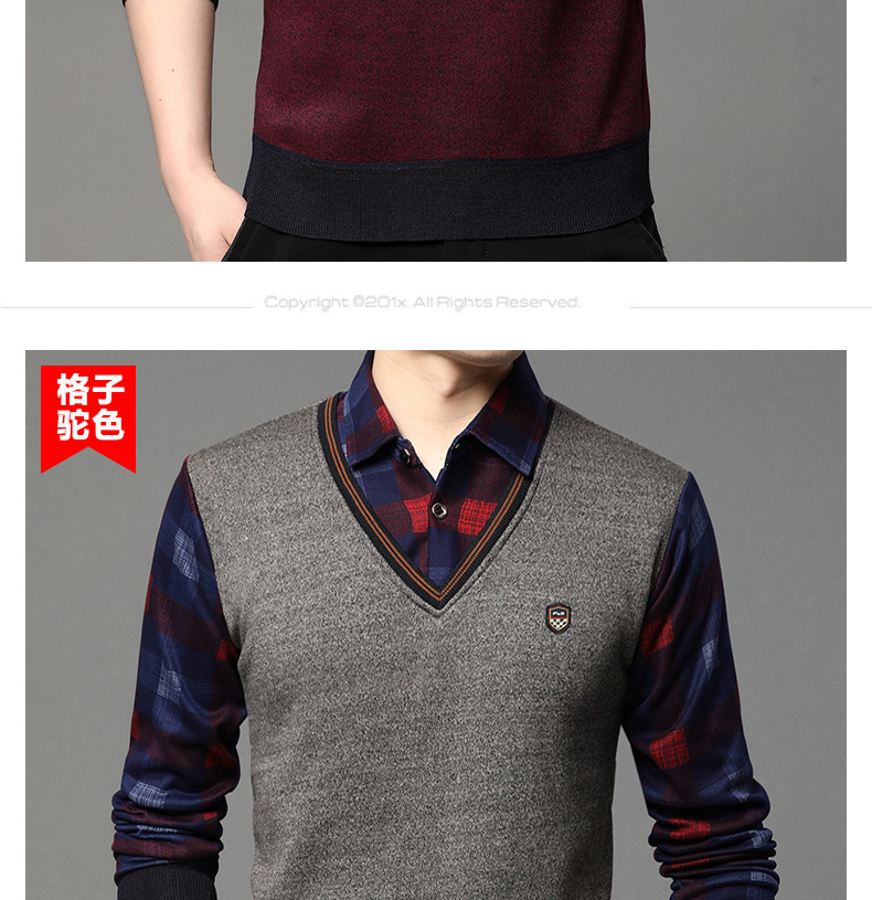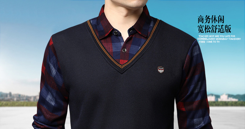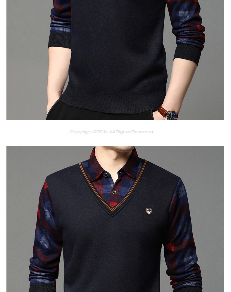 新款 假两件 毛衣 加绒 加厚 打底衫 秋冬季 中青年 衬衫领 针织衫 外套