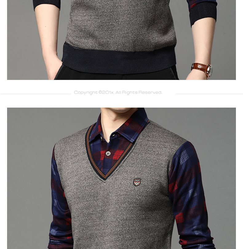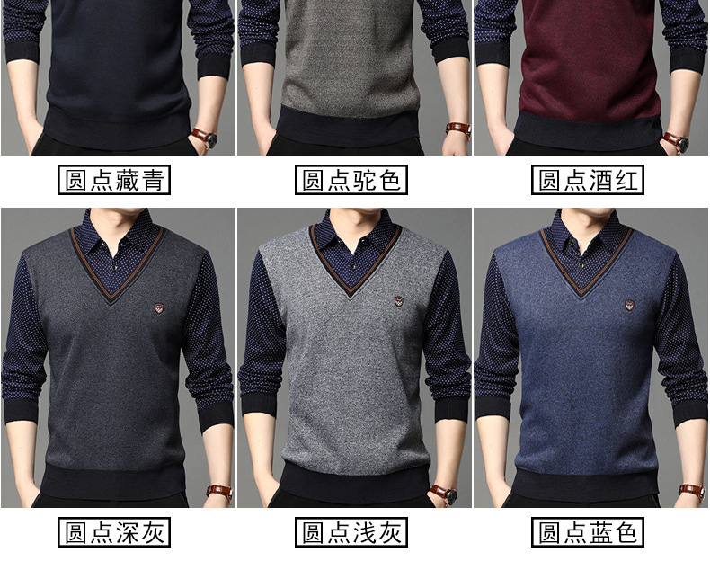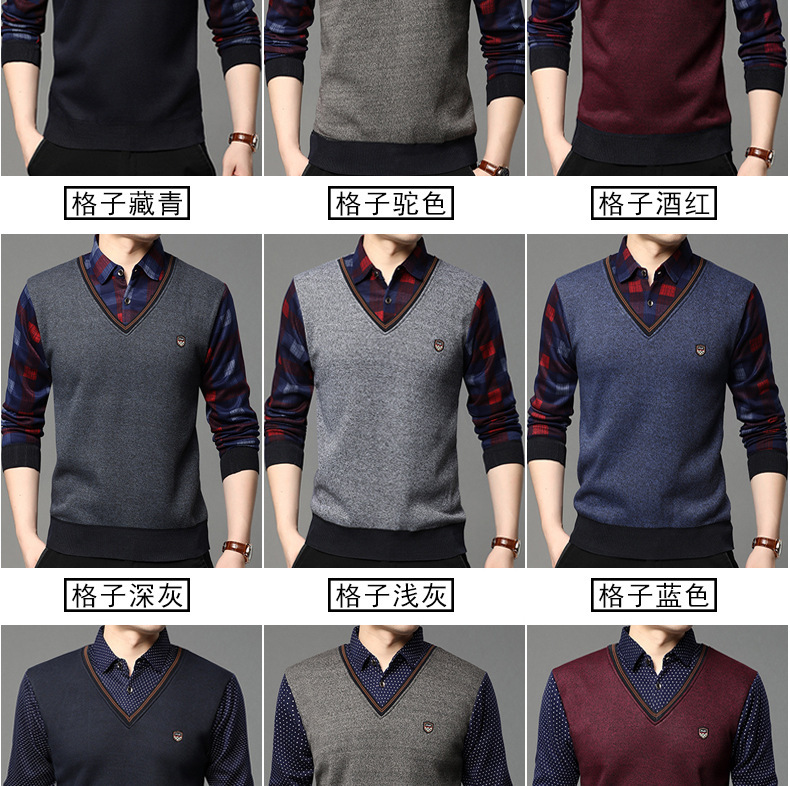 新款假两件毛衣男加绒加厚打底衫秋冬季中青年衬衫领针织衫外套