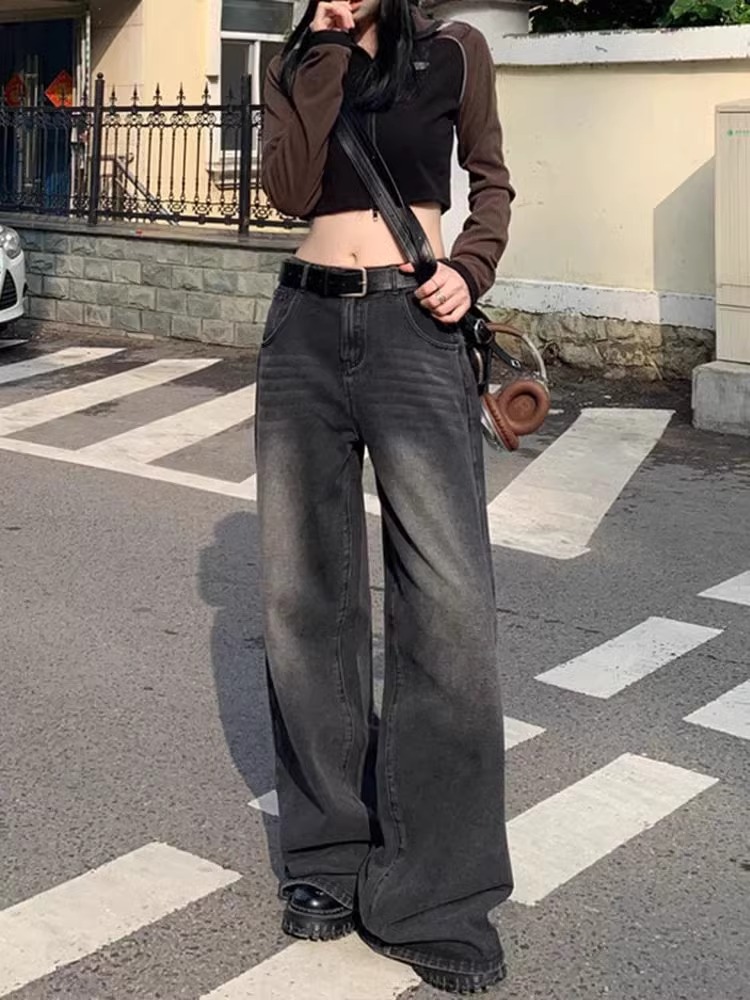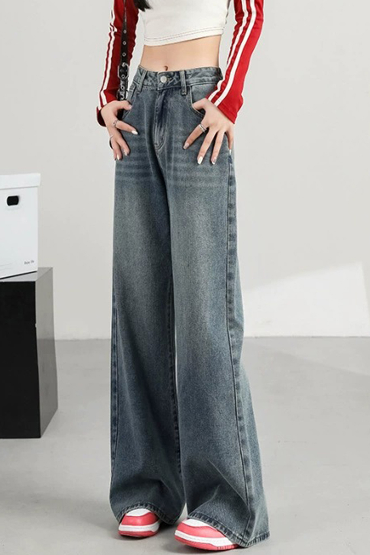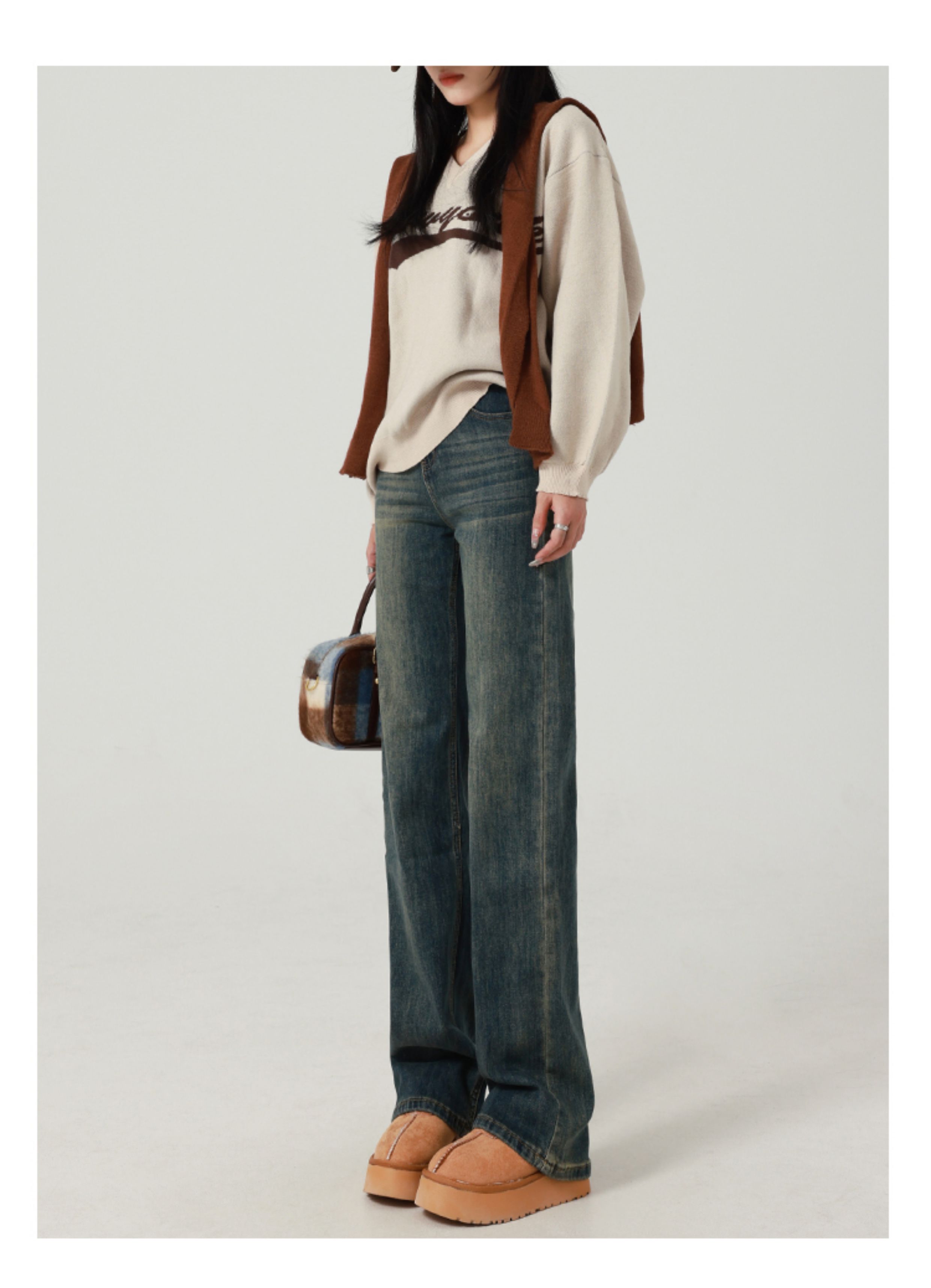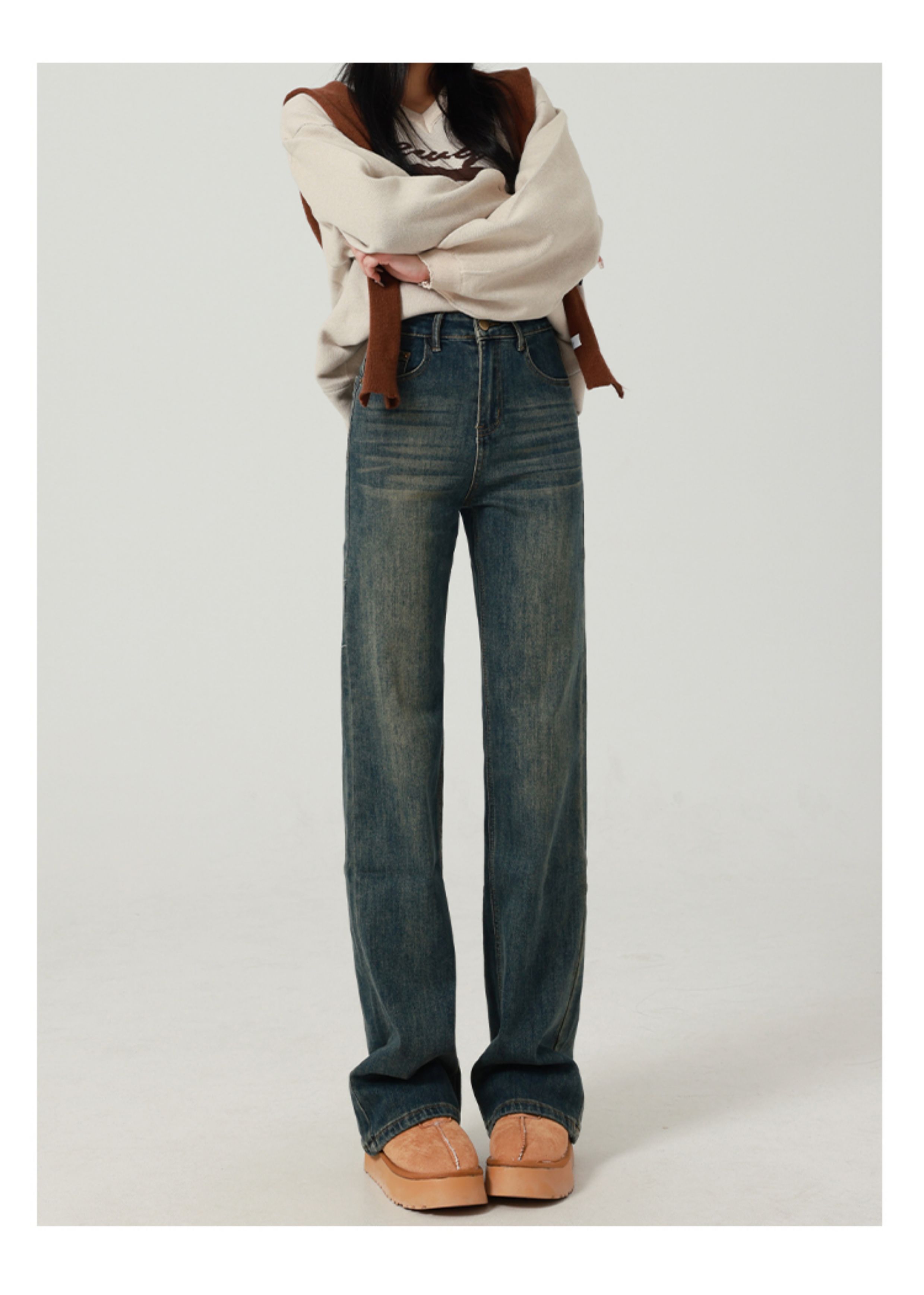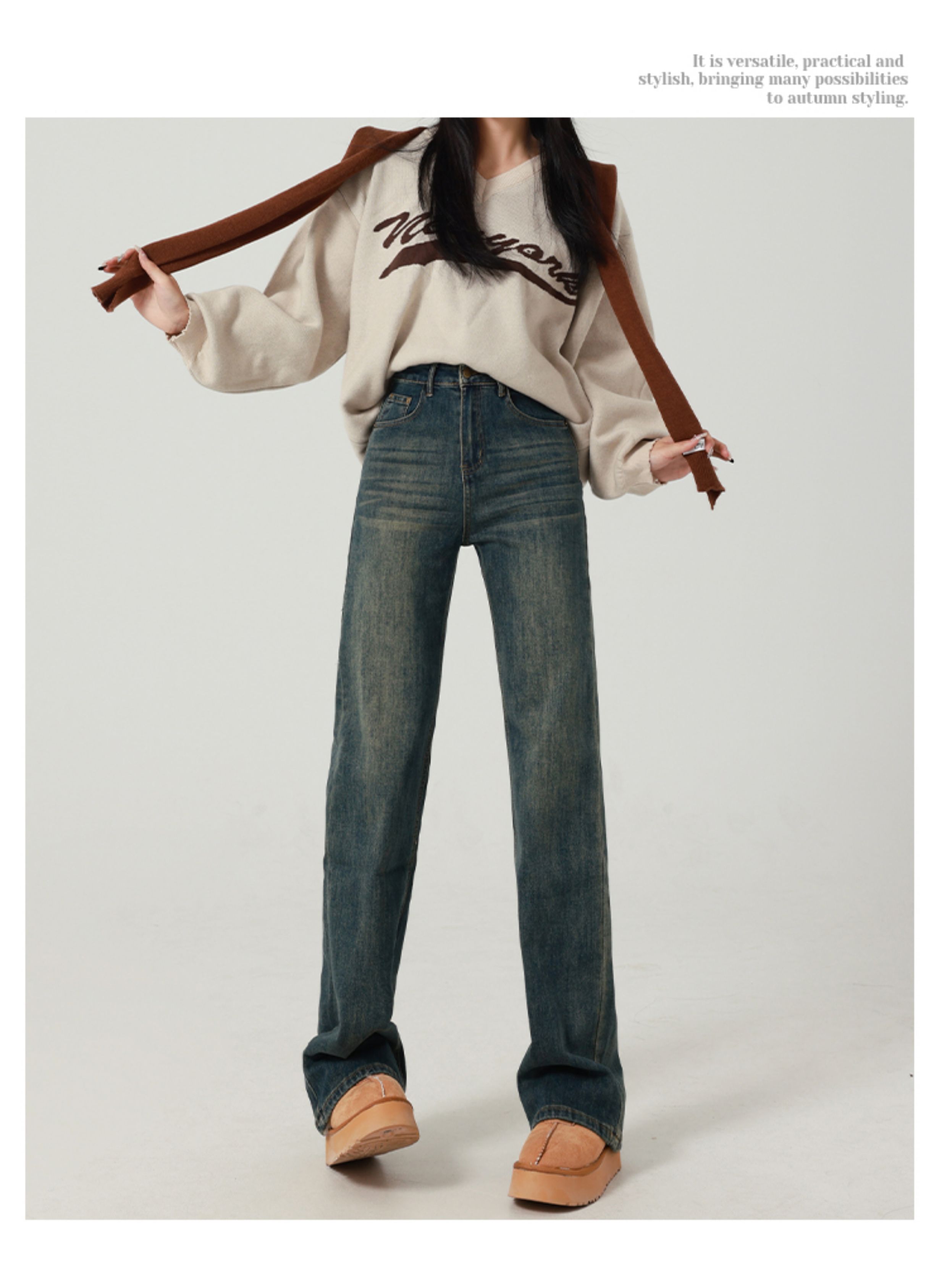 复古蓝、高腰阔腿牛仔裤、2025秋冬新款、宽松显瘦、垂感直筒、做旧拖地裤、女装