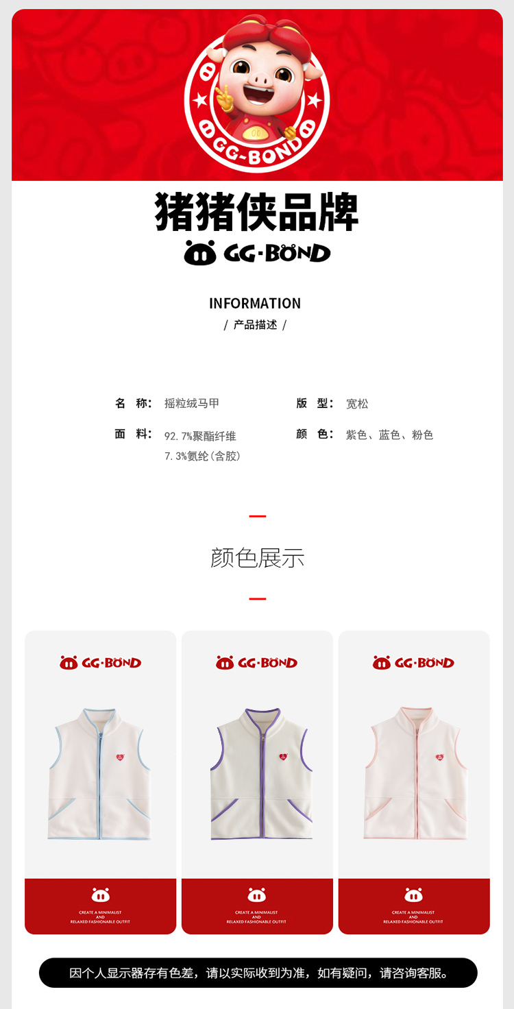 “ GGBOND猪猪侠秋冬新款摇粒绒儿童加厚马甲来啦!这款马甲专为儿童设计,采用优质摇粒绒材质,保暖性能超棒,让孩子们在秋冬季节也能温暖舒适。时尚的款式,男女童都能轻松驾驭,穿上瞬间变身可爱小达人。无论是日常出行还是户外活动,它都是孩子们的绝佳选择。