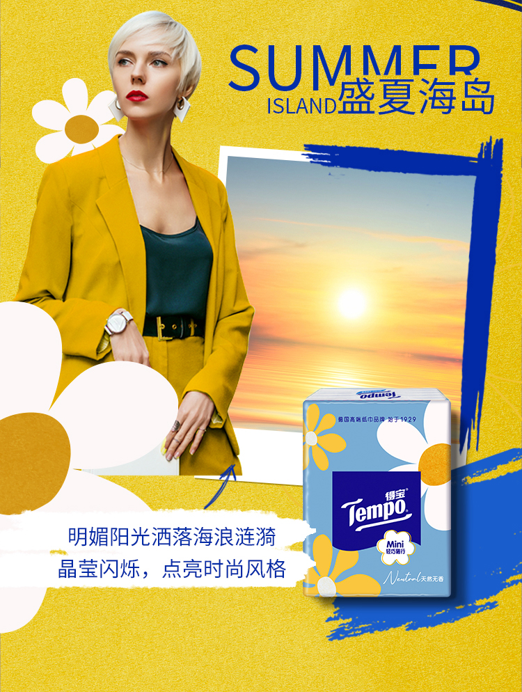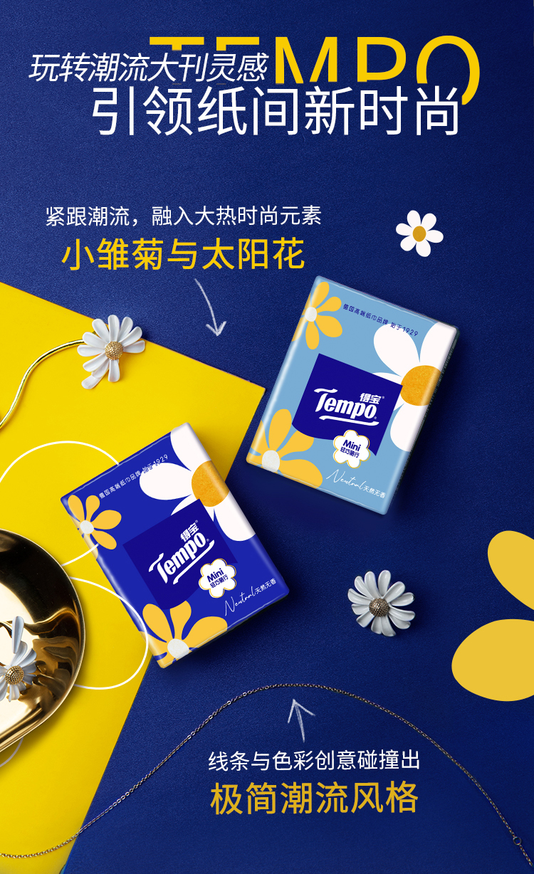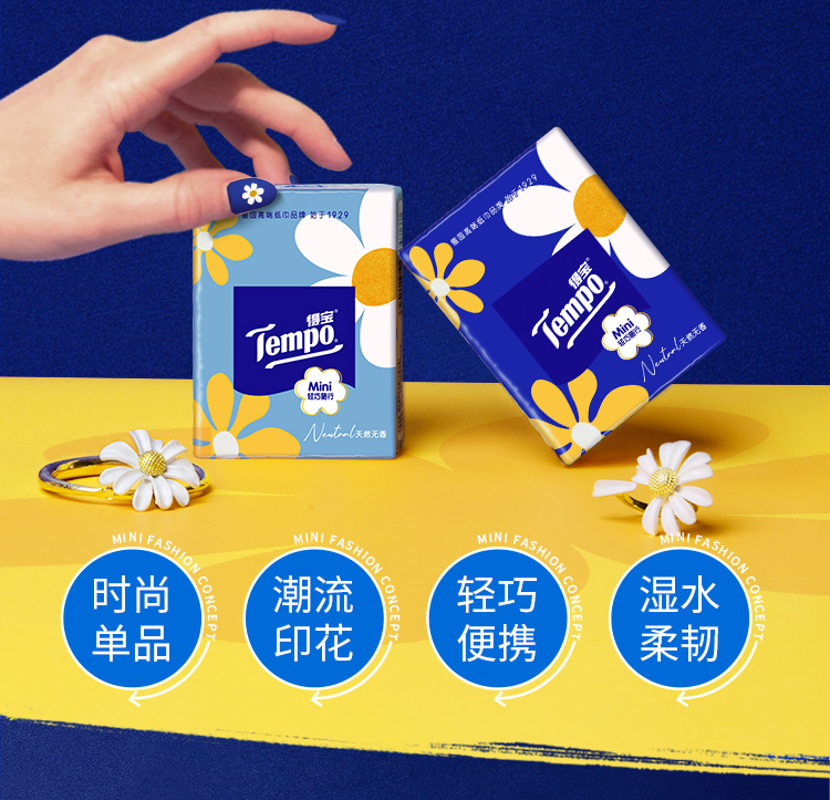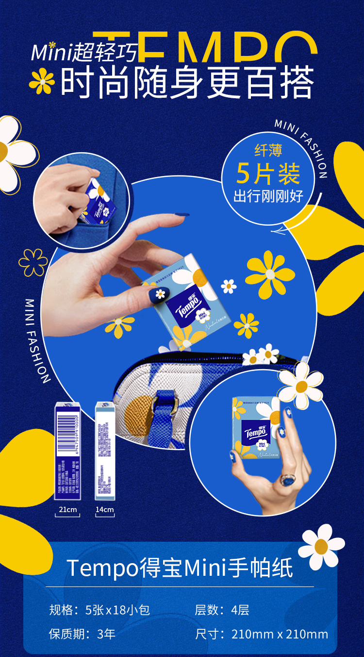 “ Tempo得宝推出的太阳花Mini迷你印花手帕纸,采用四层加厚设计,纸质厚实柔软。每包5张,共54小包,方便携带。包装上的太阳花印花精致可爱,为日常使用增添一抹亮色。无论是放在口袋还是包包里,都十分合适,随时满足你的用纸需求。