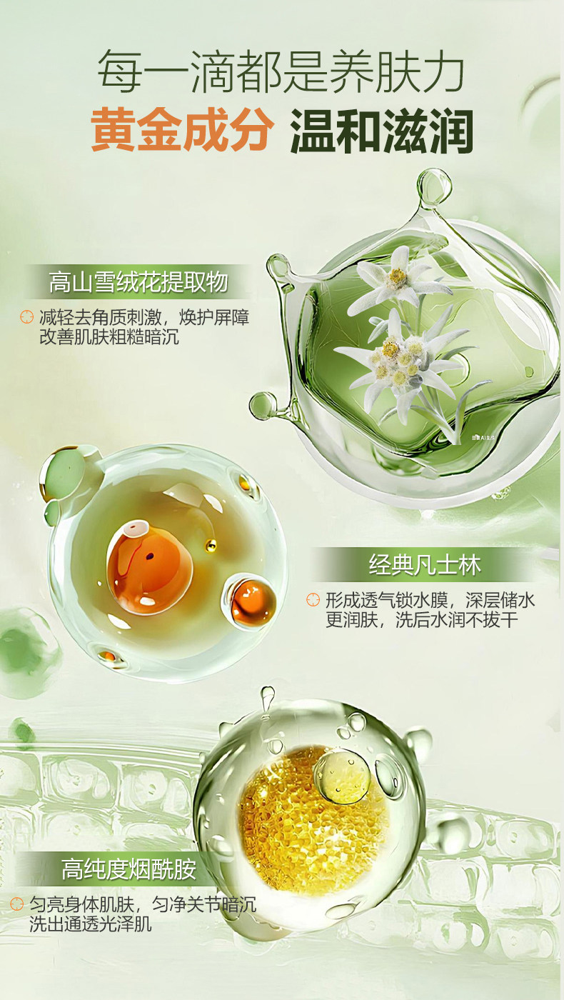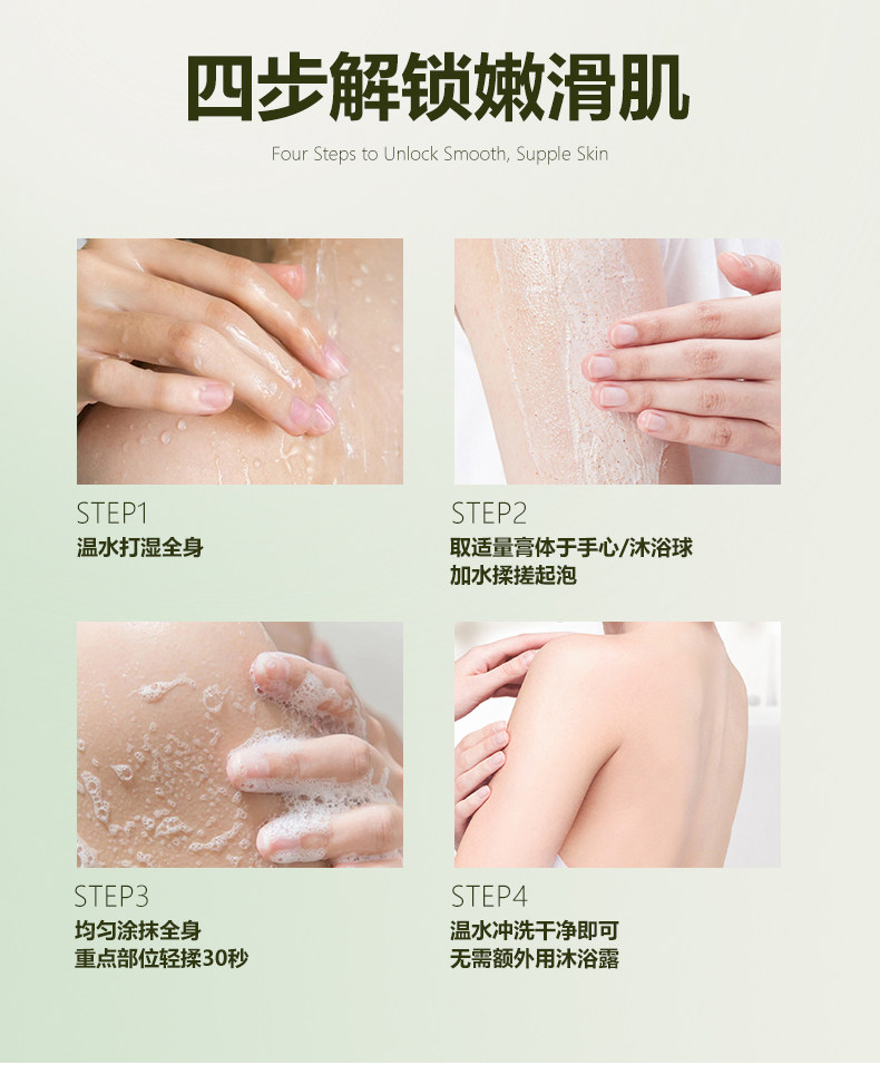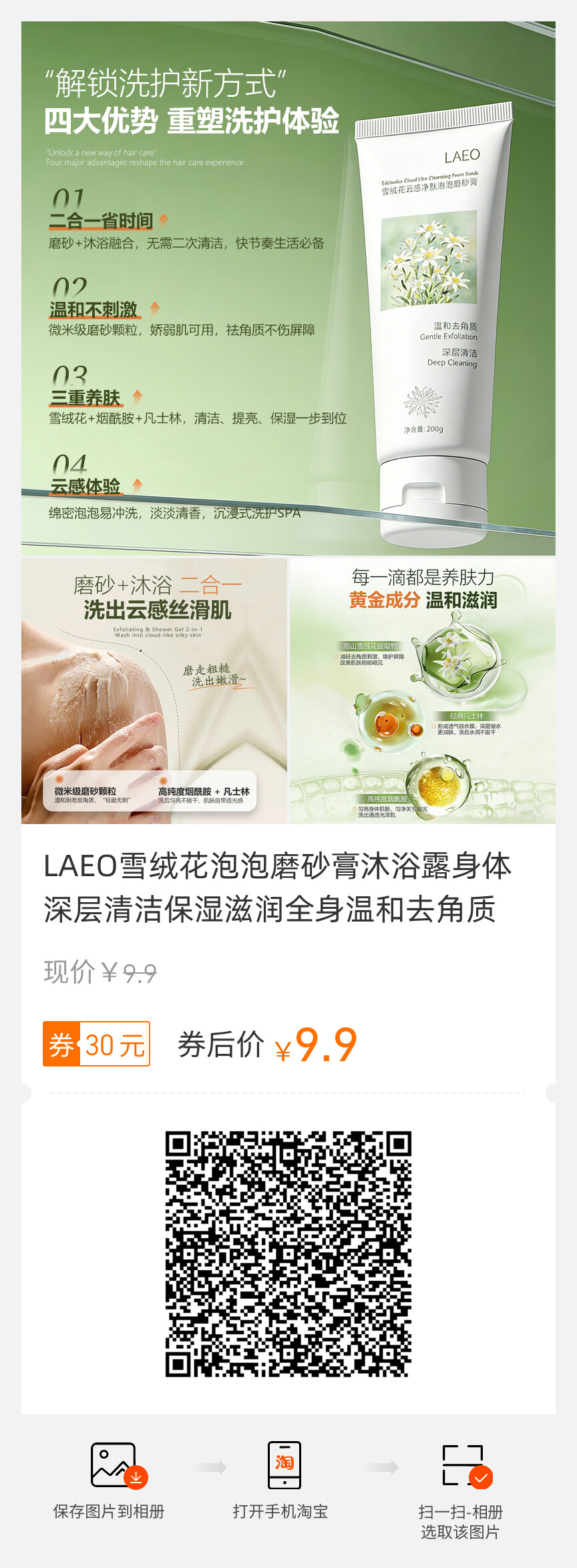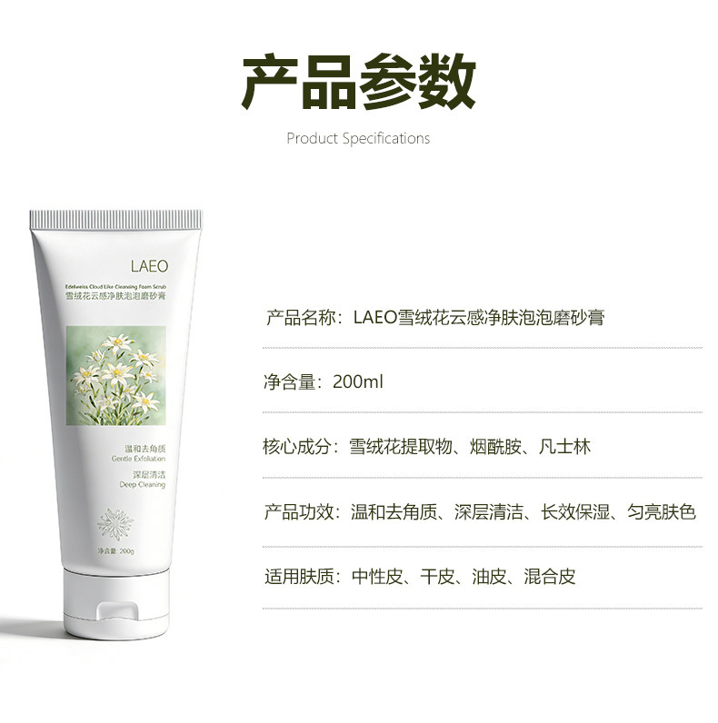 LAEO、雪绒花、泡泡磨砂膏、沐浴露、深层清洁、温和去角质