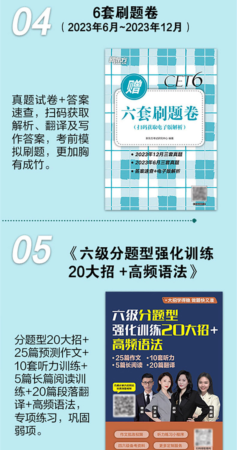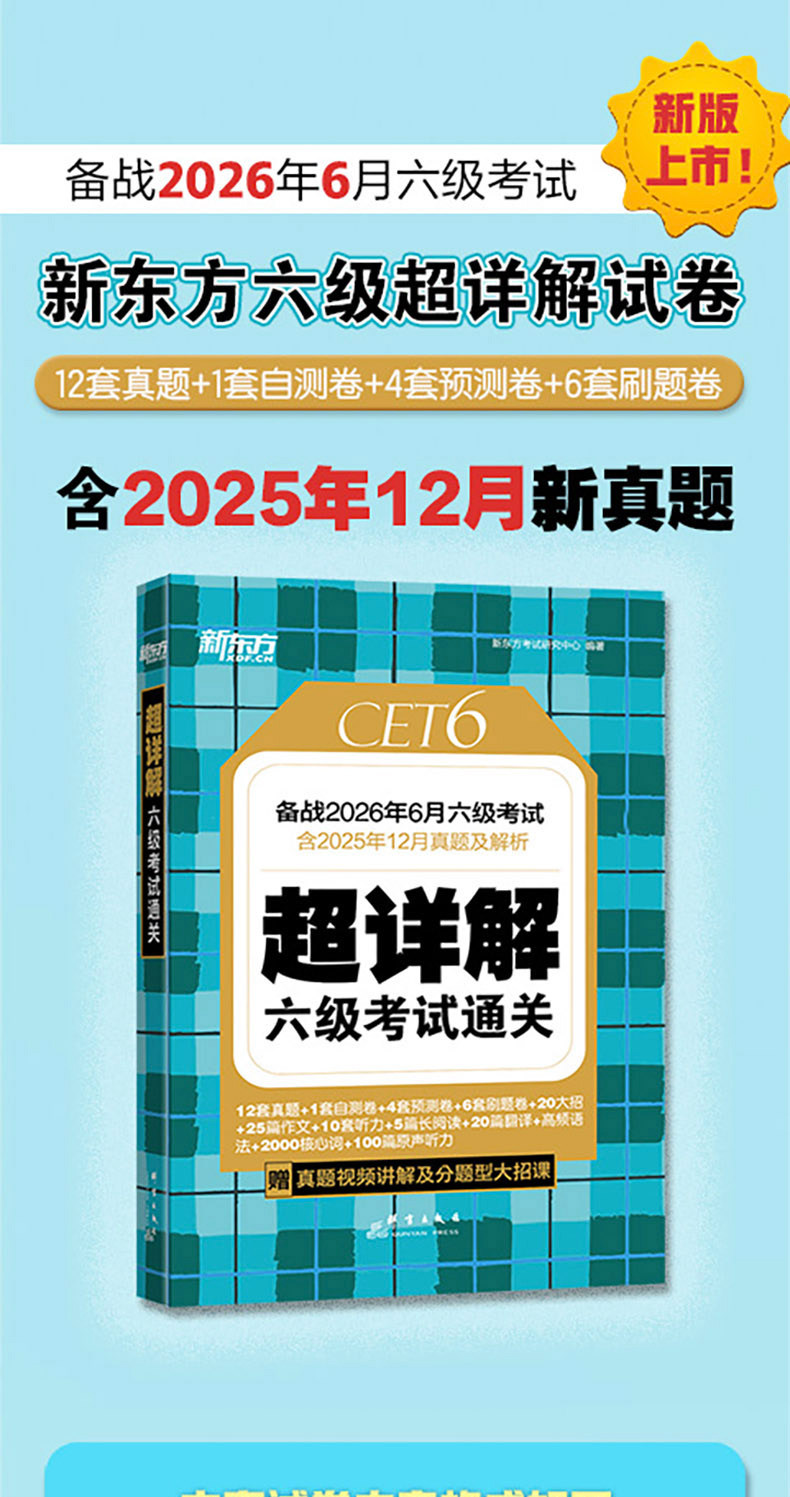 备考2026年6月 新东方英语六级真题试卷大学四六级考试历年超详解真题模拟词汇单词 阅读理解听力翻译写作文预测专项训练资料cet6