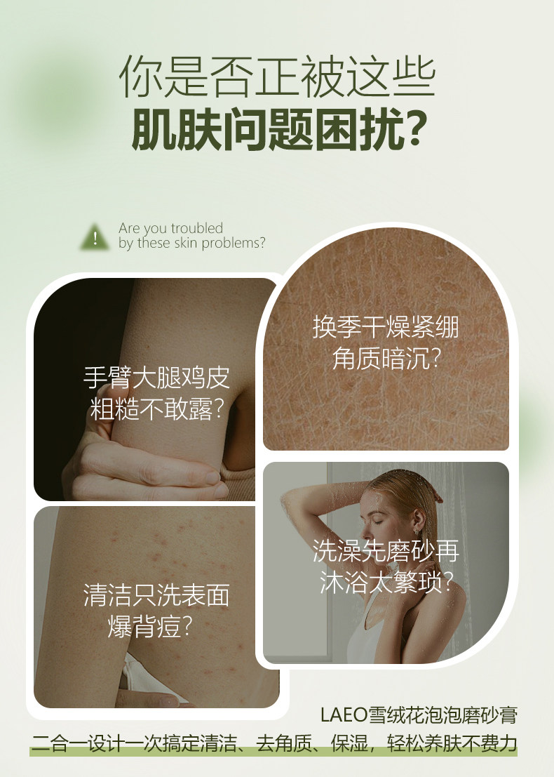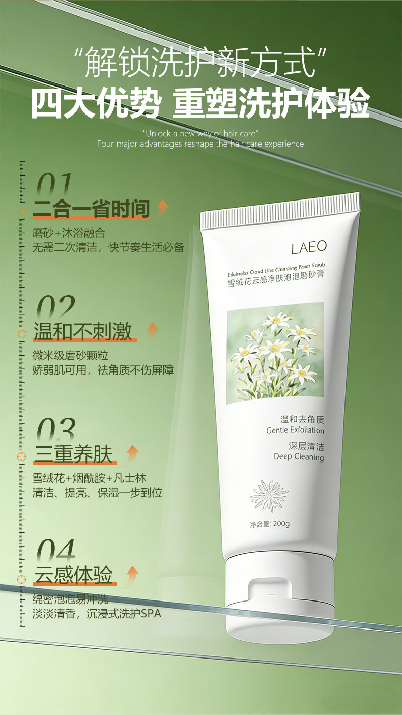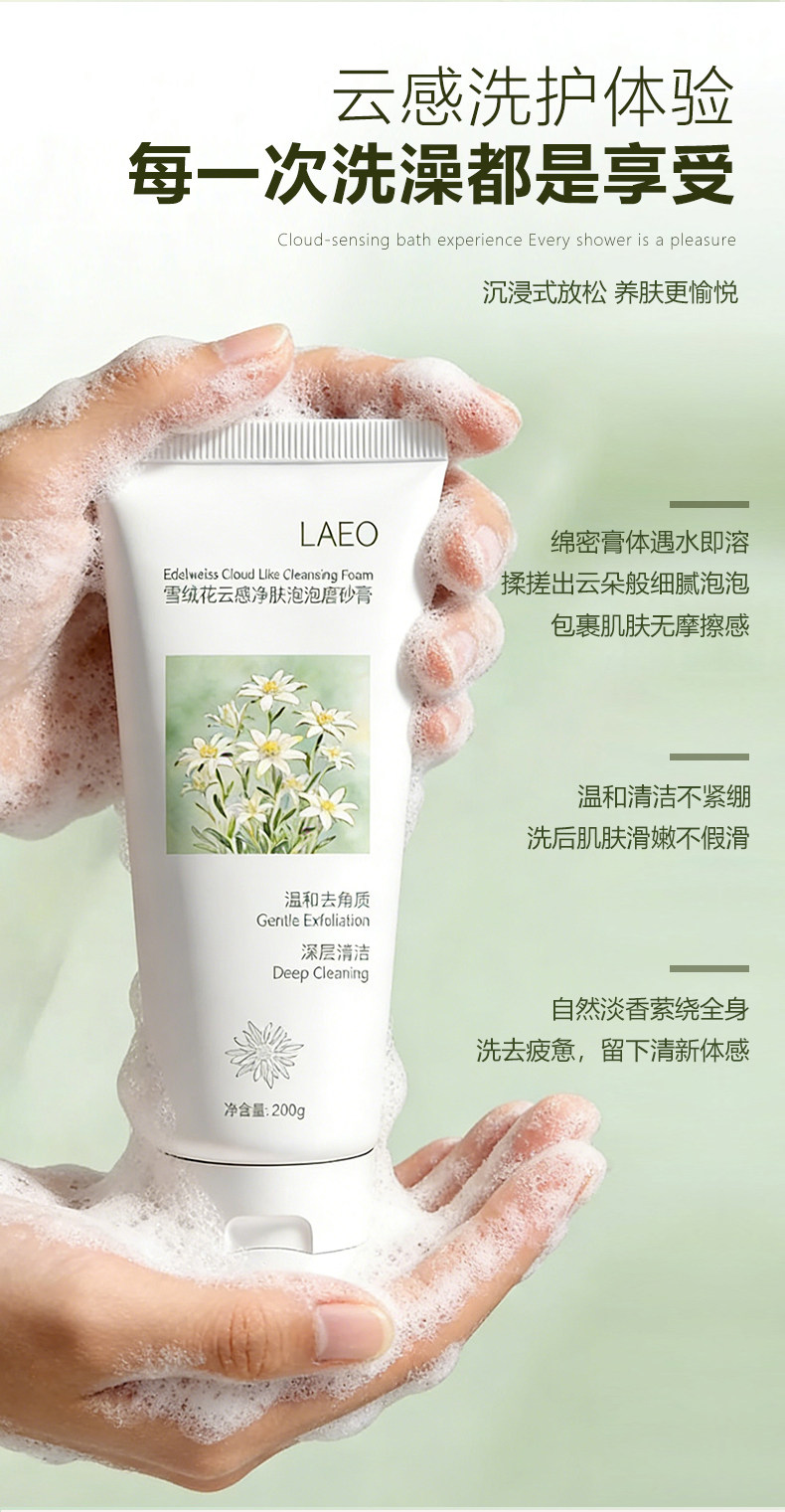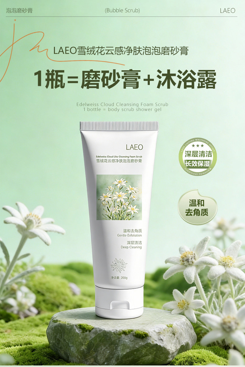 LAEO、雪绒花、泡泡磨砂膏、沐浴露、深层清洁、温和去角质