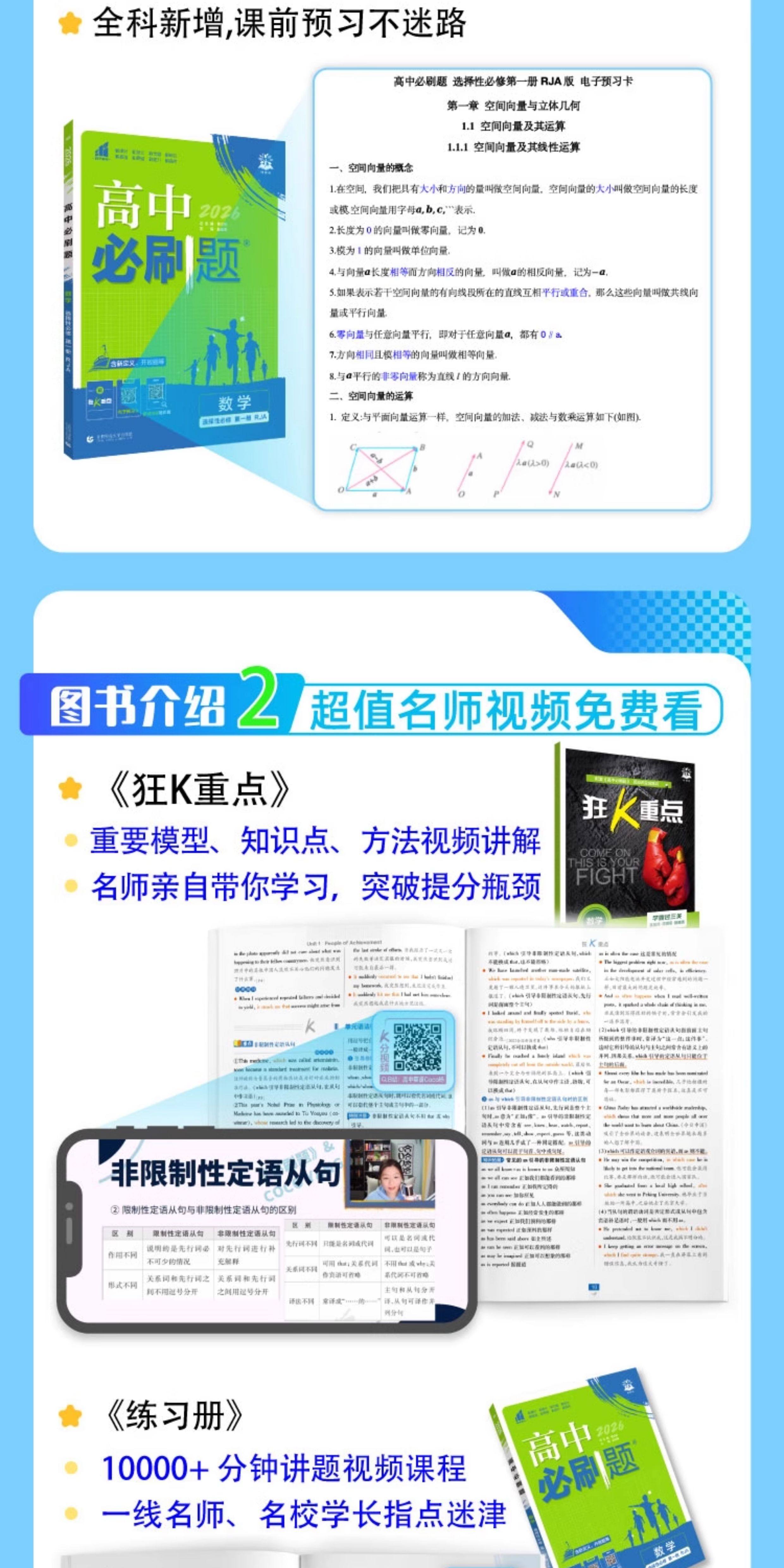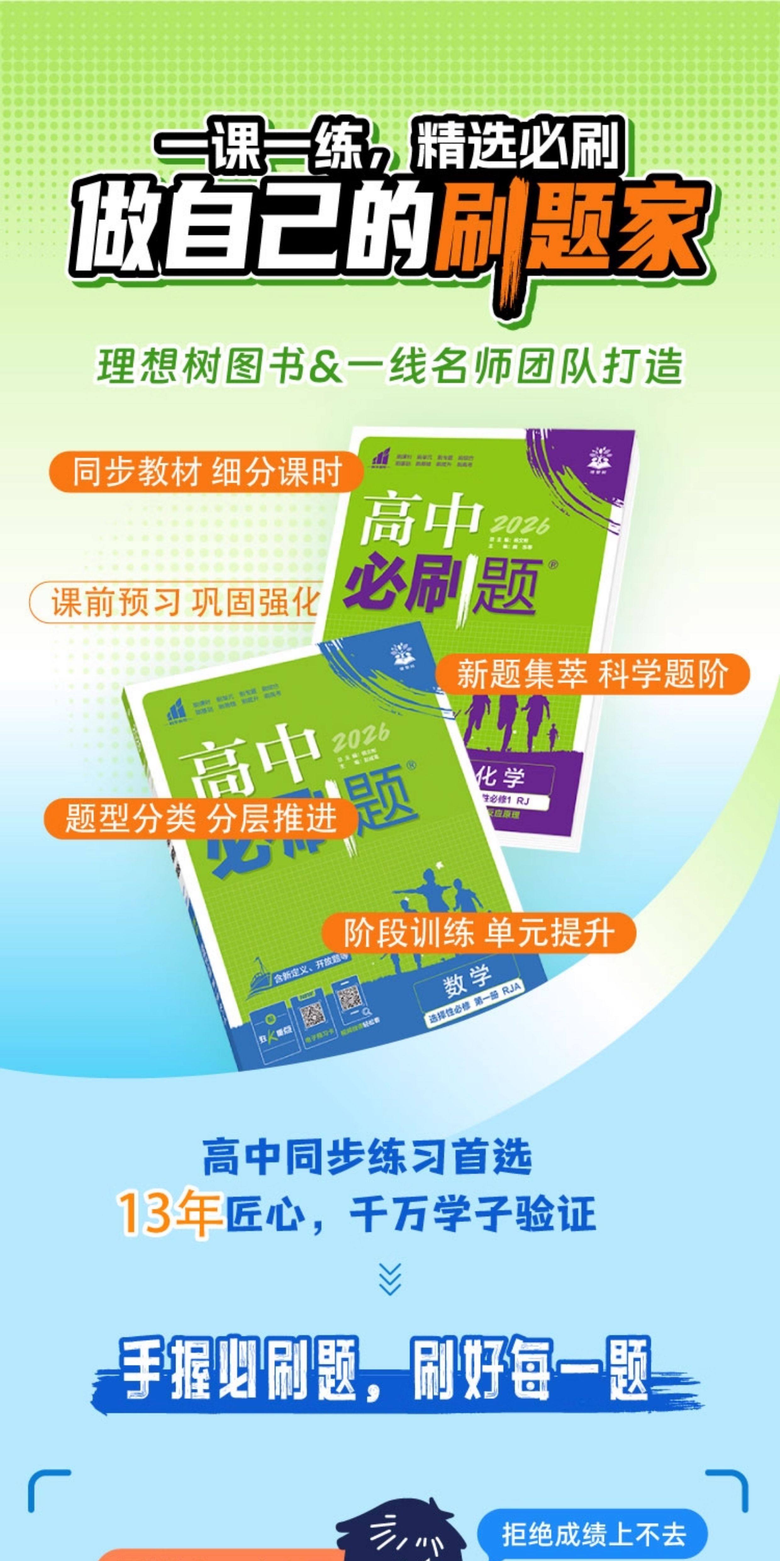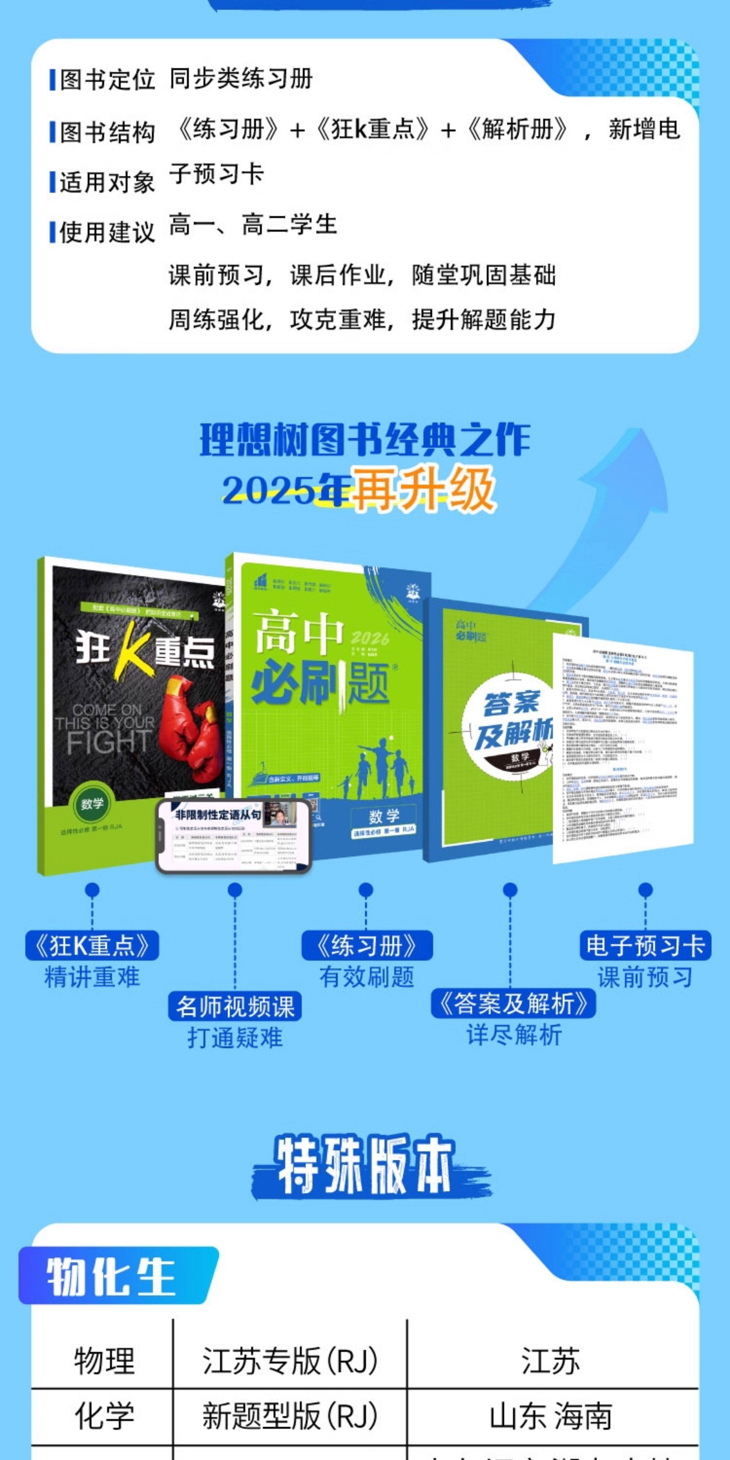 “ 理想树2026高中必刷题,涵盖高一下数学、物理、化学、生物必修二必修一,以及高二上下册语文、英语、政治、历史、地理选择性必修123。紧贴人教版RJ教材,不仅有丰富的练习题,还附带狂K重点,帮助学生精准把握考点,提升学习效率,是高中生提升成绩的得力助手。