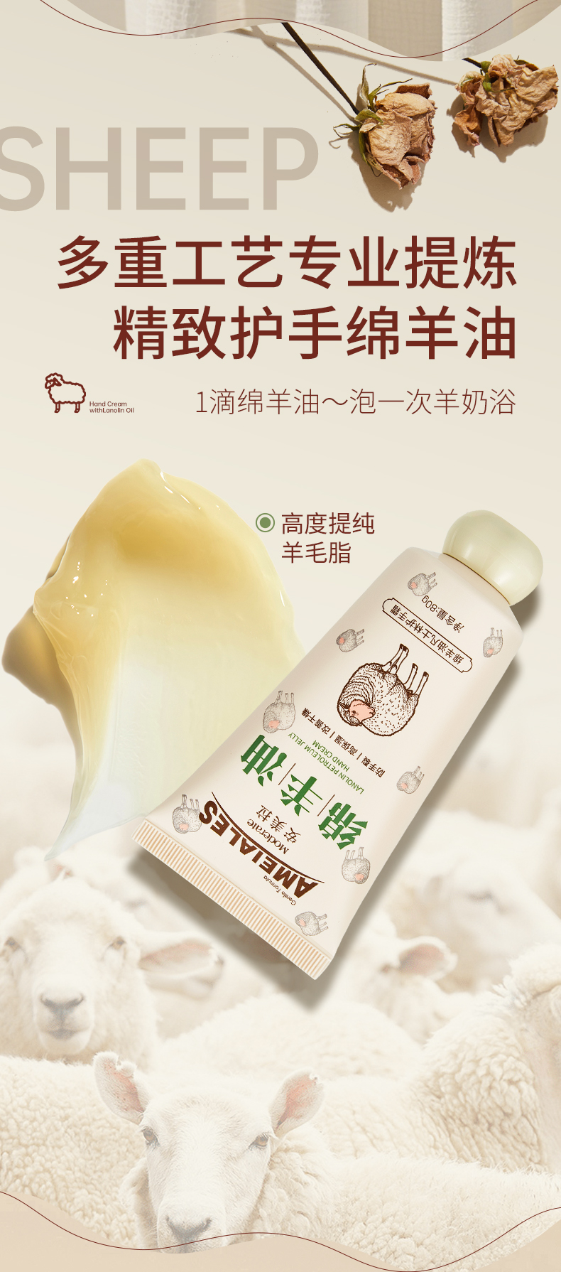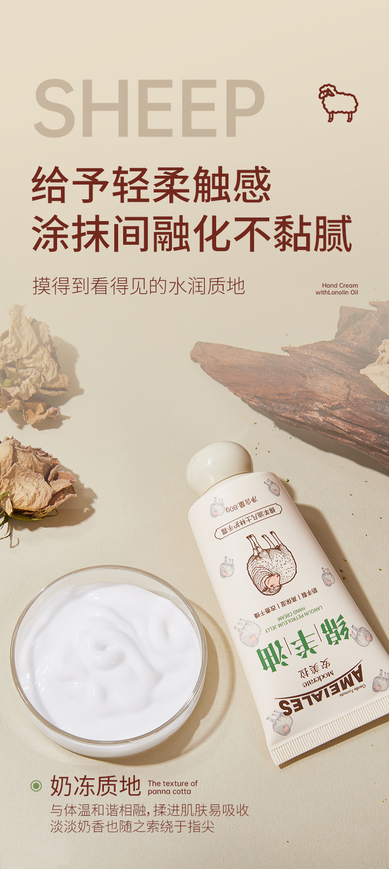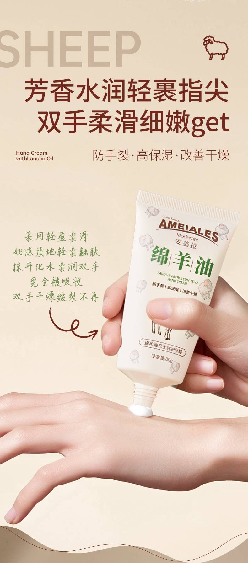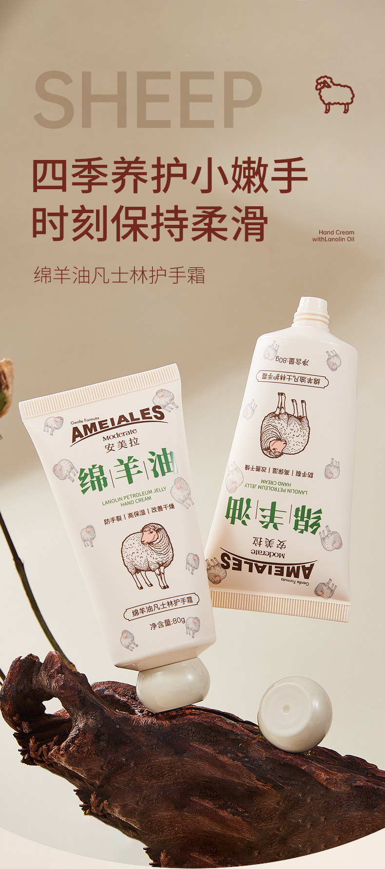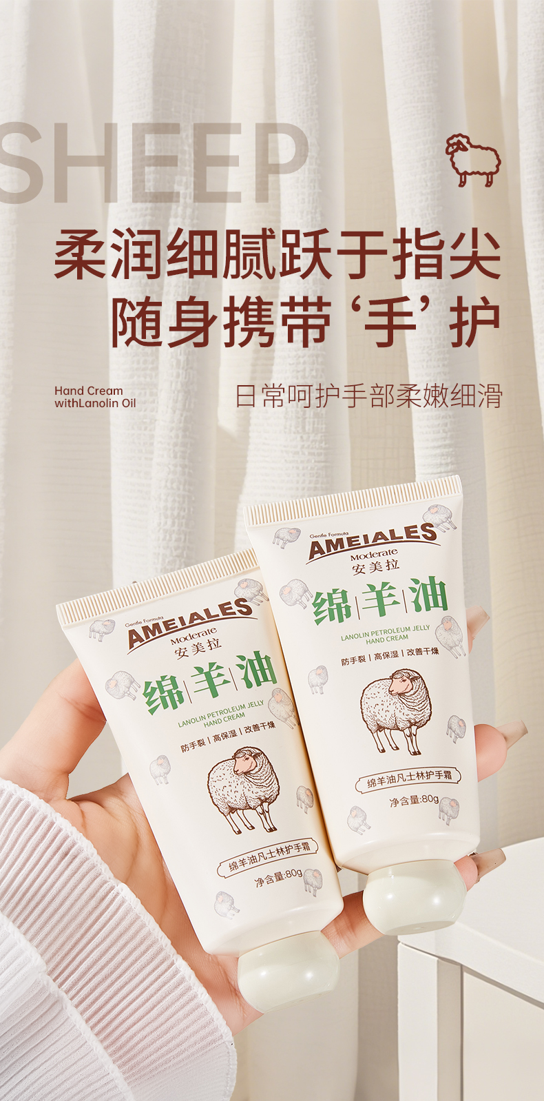“ 安美拉绵羊油凡士林护手霜,专为秋冬设计。富含绵羊油与凡士林成分,滋润保湿效果显著,能有效防止手部干裂。质地轻盈不油腻,使用后手部肌肤水润柔滑。小支便携包装,方便随身携带,随时随地为手部提供滋养呵护,是秋冬季节必备的护手好物。