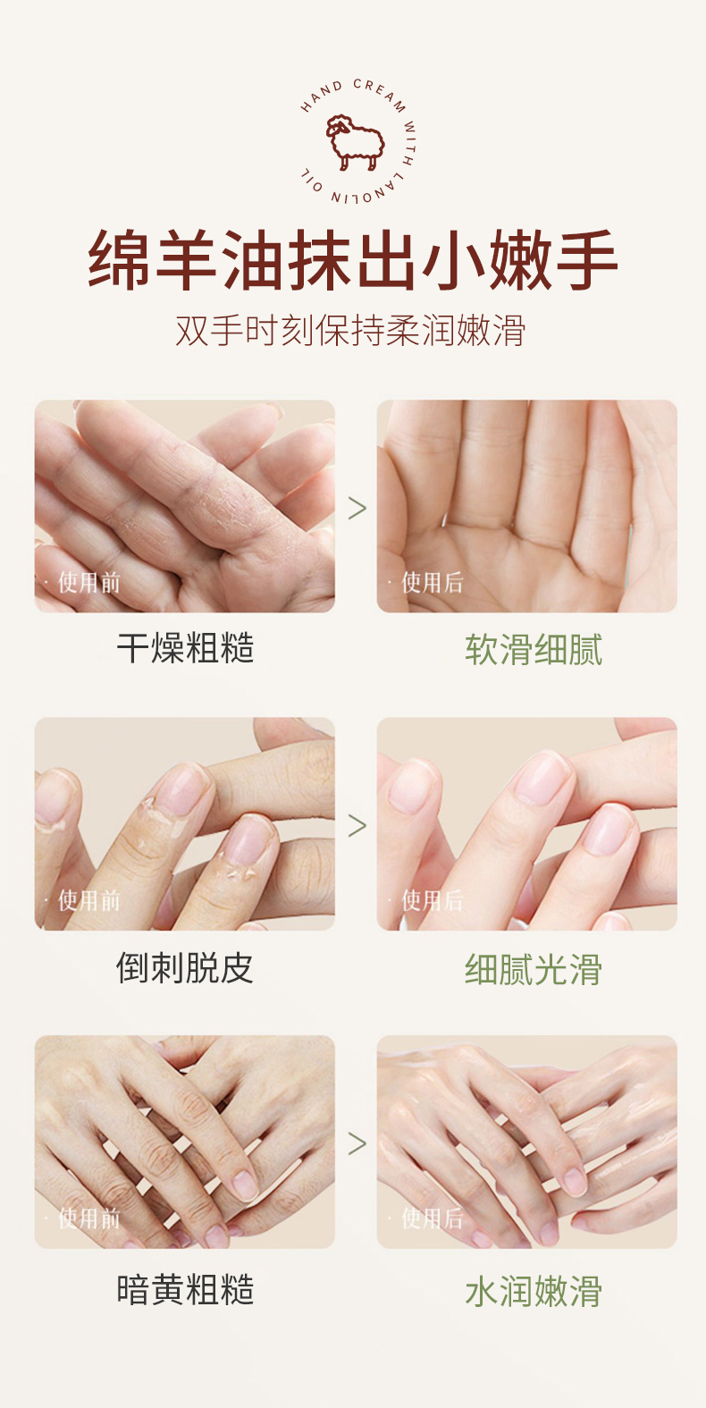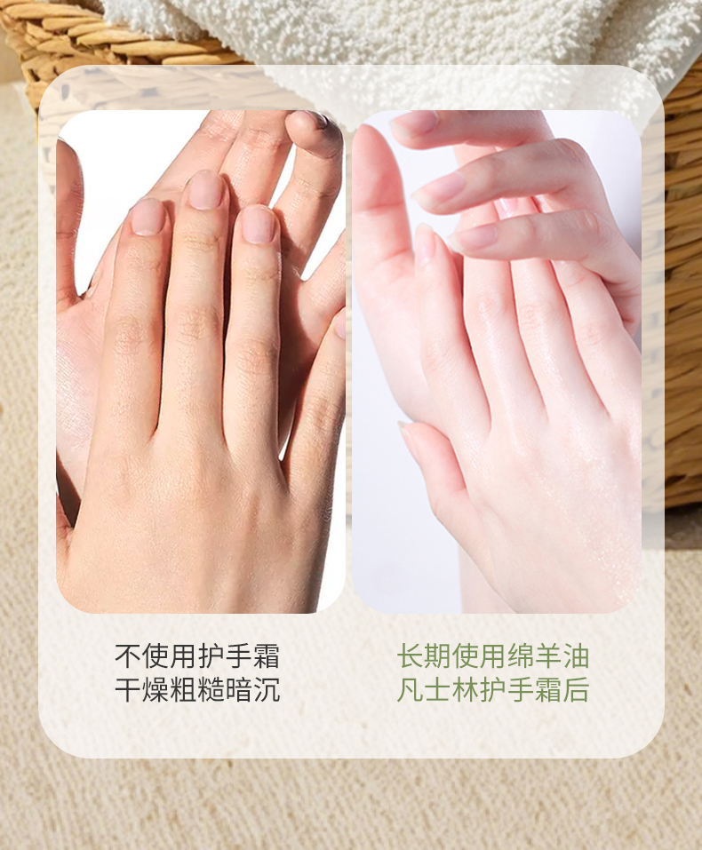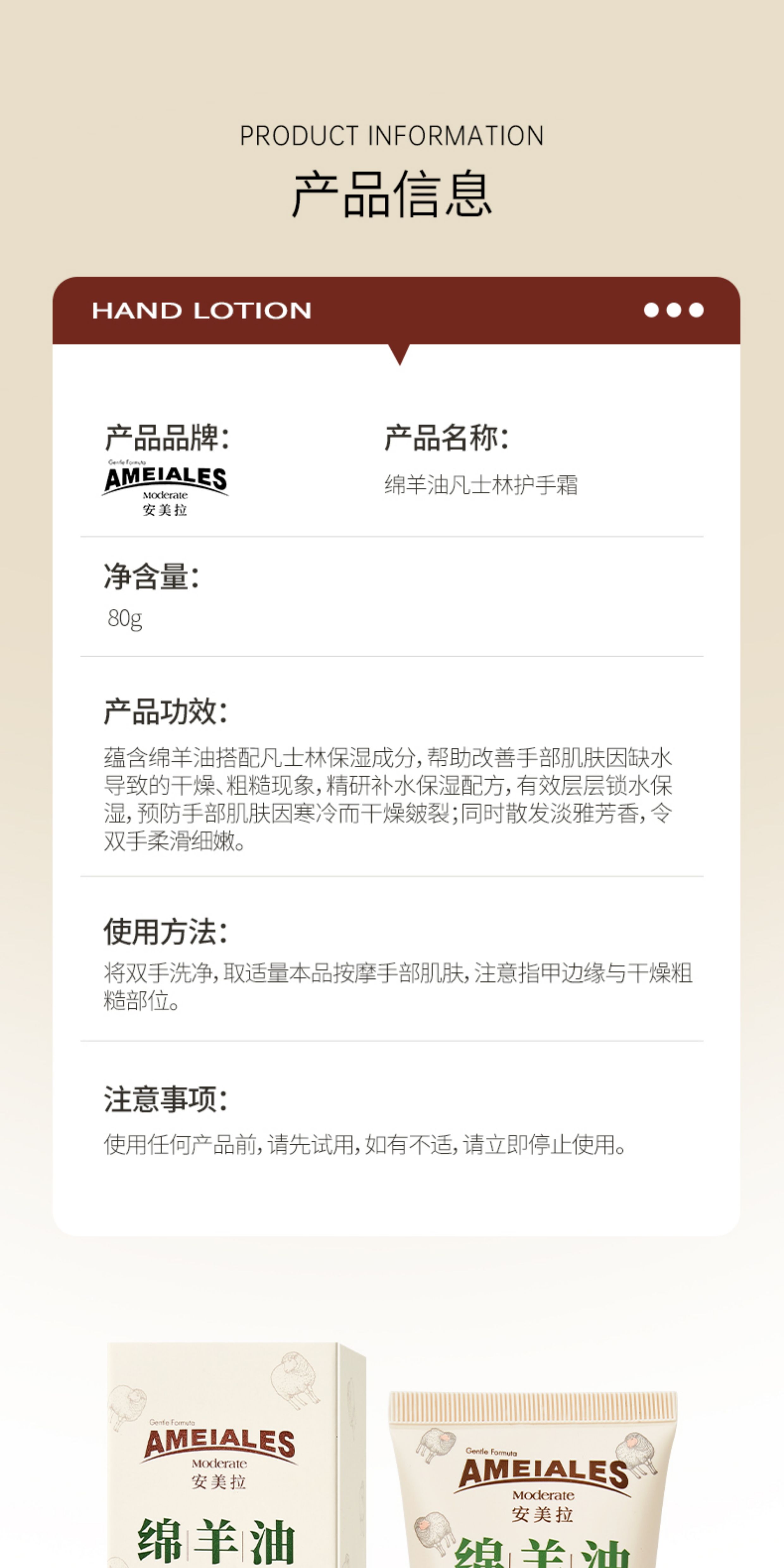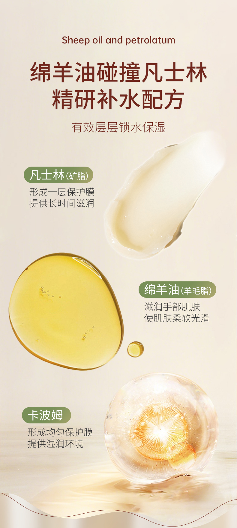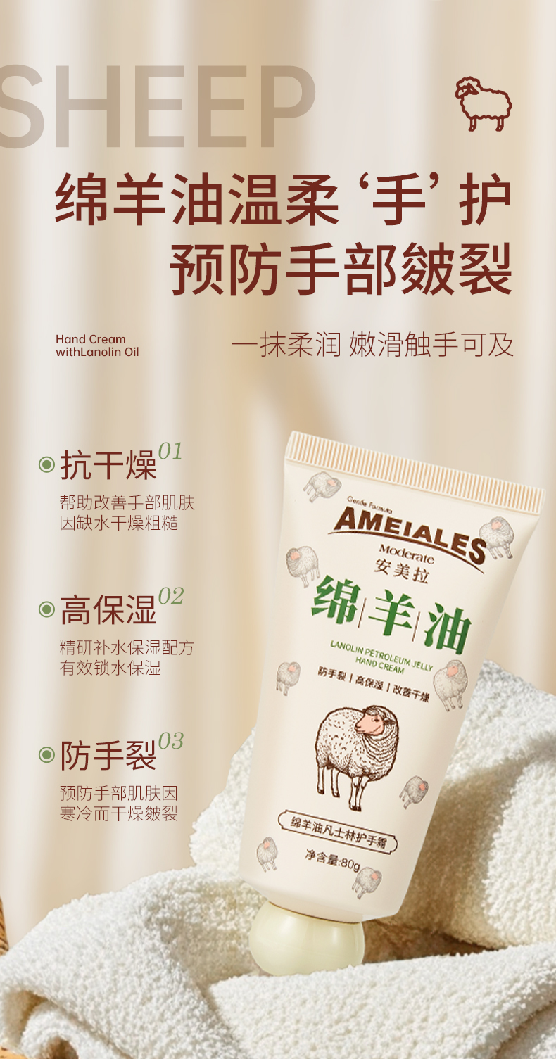“ 安美拉绵羊油凡士林护手霜,专为秋冬设计。富含绵羊油与凡士林成分,滋润保湿效果显著,能有效防止手部干裂。质地轻盈不油腻,使用后手部肌肤水润柔滑。小支便携包装,方便随身携带,随时随地为手部提供滋养呵护,是秋冬季节必备的护手好物。