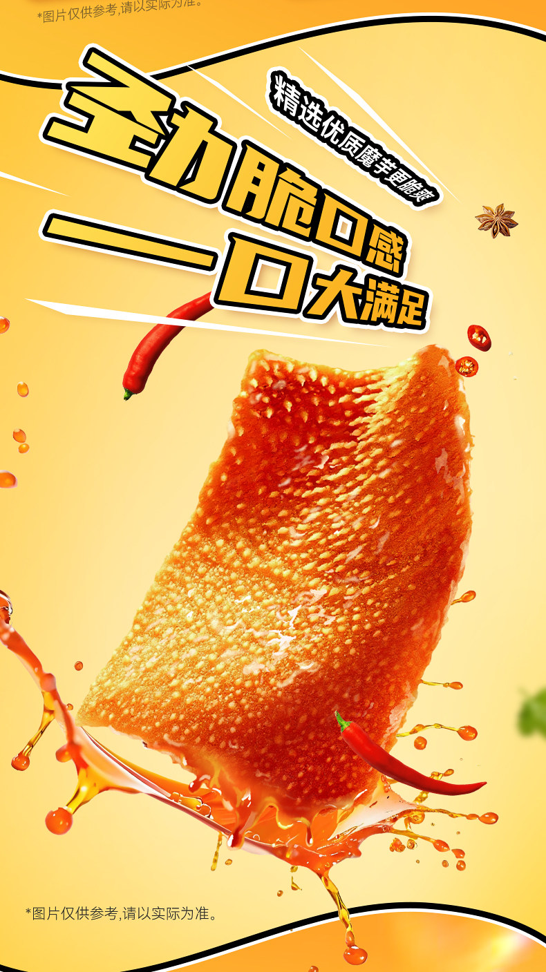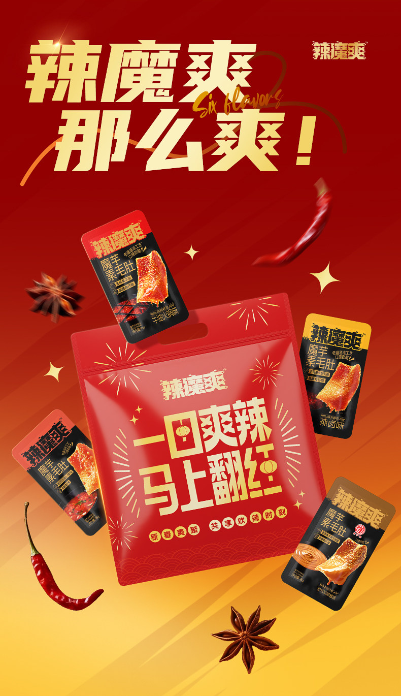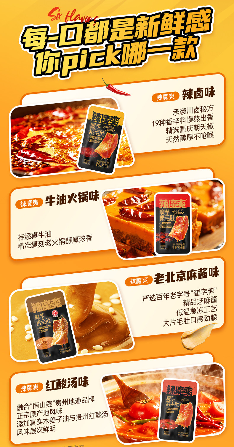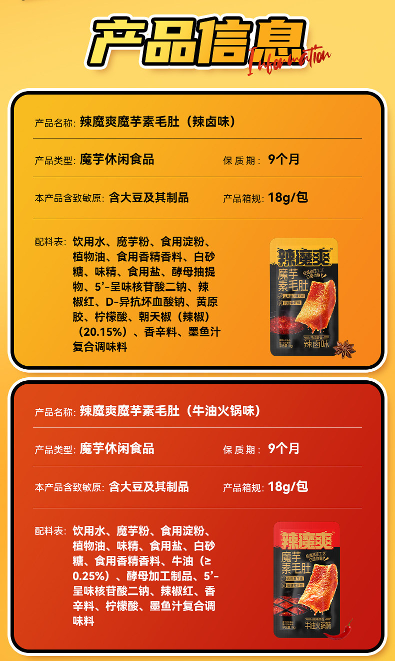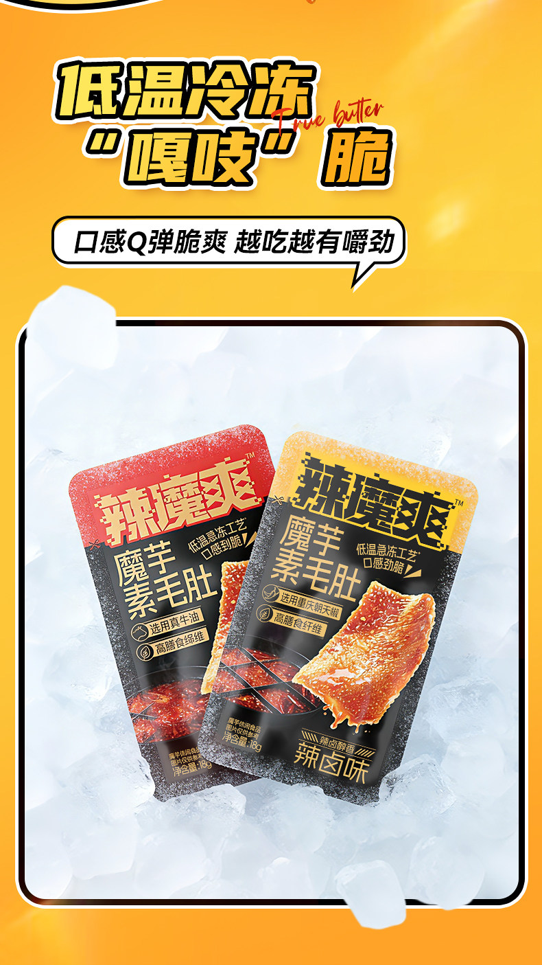“ 辣魔爽魔芋素毛肚,是追剧、办公、学生群体的绝佳零食选择。多口味混合装满足不同味蕾需求,带来丰富多样的味觉享受。独立小包装设计,方便携带与分享,随时随地都能来上一包。魔芋素毛肚口感Q弹有嚼劲,仿佛在品尝真实的毛肚。