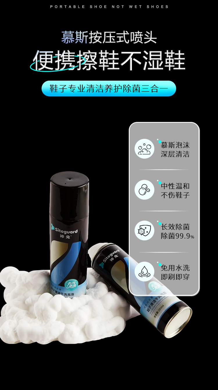 “ 神兔小白鞋清洗剂,堪称球鞋救星!它拥有独特的刷鞋泡沫,配合喷头设计,使用便捷。不仅能有效去除球鞋上的污渍,还能轻松解决鞋子发黄难题。而且它是免水洗的,擦一擦就能让鞋子恢复洁净,让你的球鞋时刻保持崭新状态,无论是日常穿着还是运动后,都能快速清洁。
