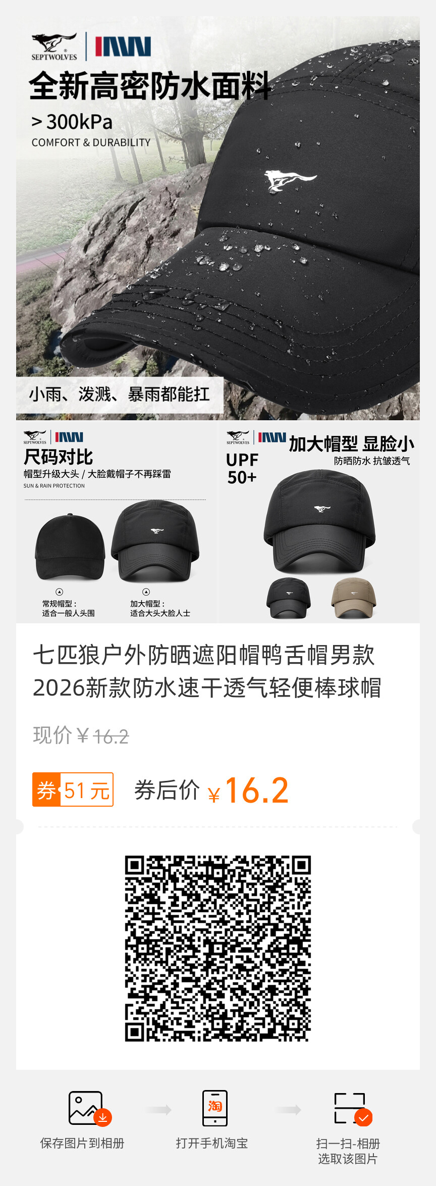 七匹狼户外防晒遮阳帽鸭舌帽男款2026新款防水速干透气轻便棒球帽