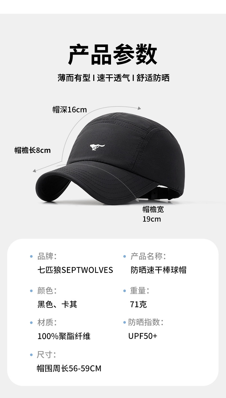 七匹狼、户外防晒、遮阳帽、鸭舌帽、男款、防水速干