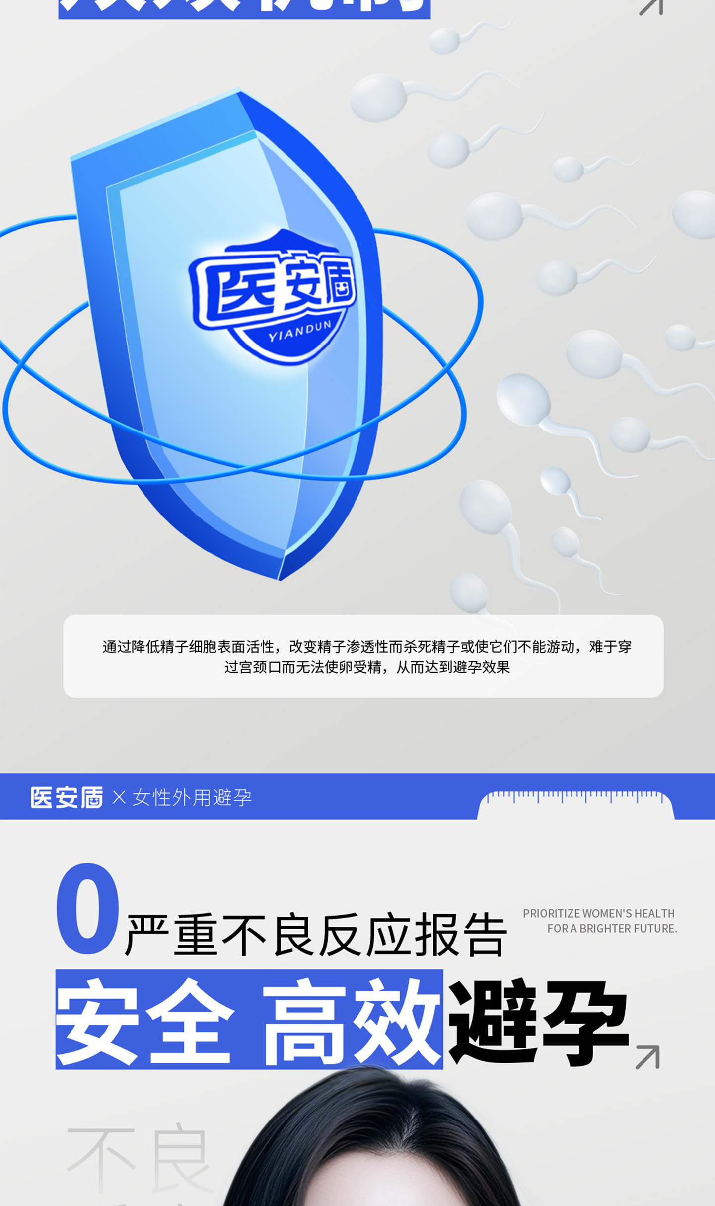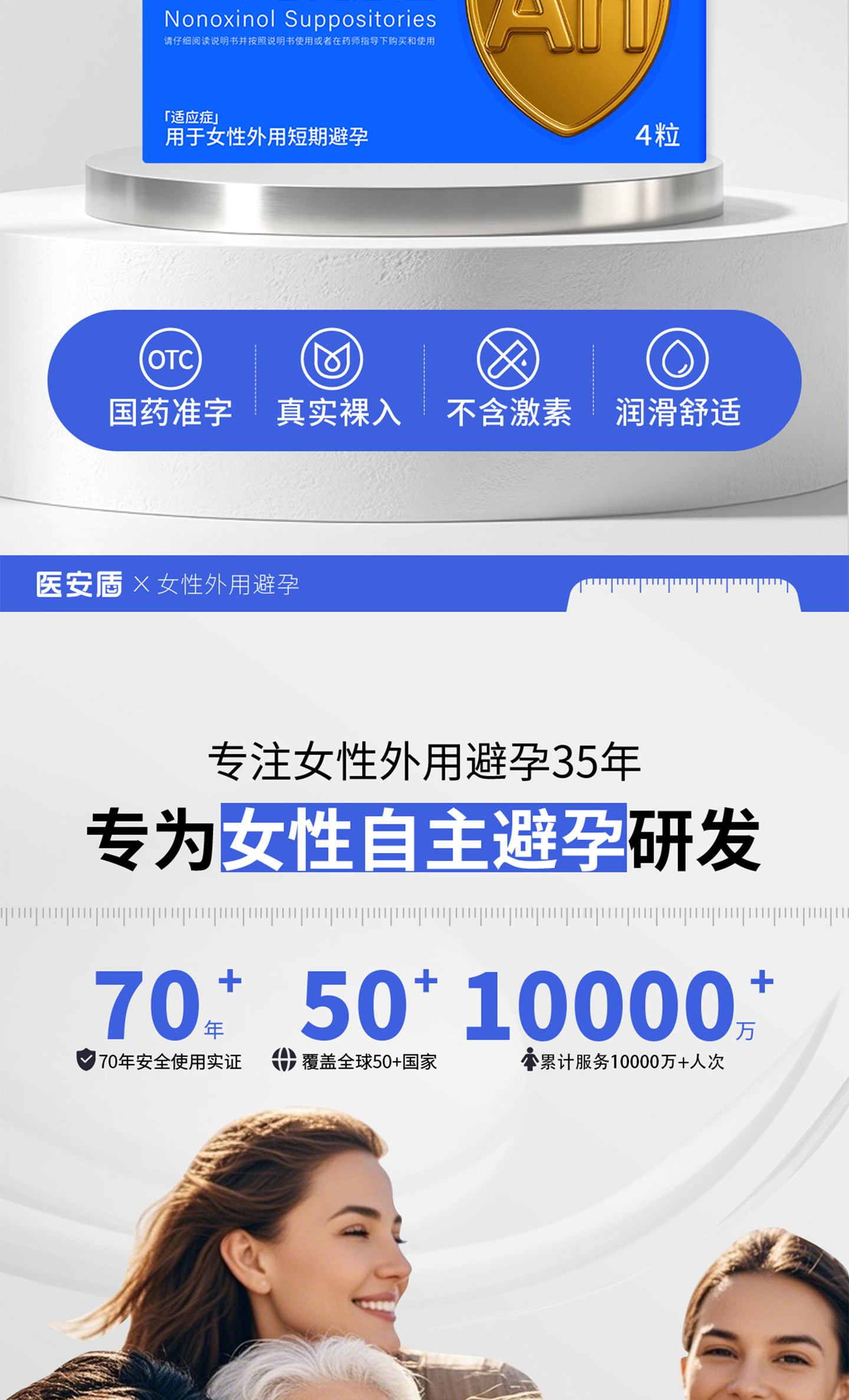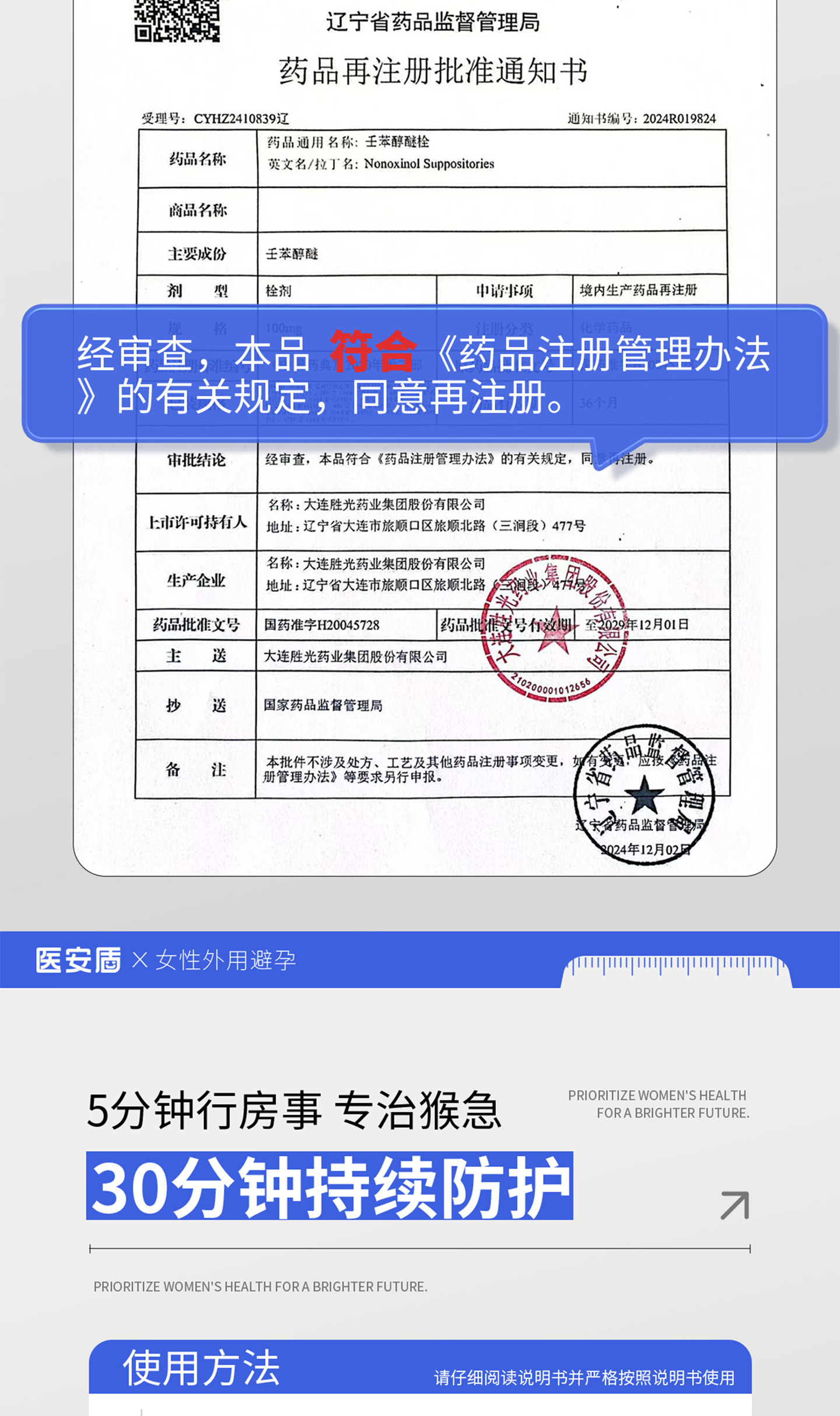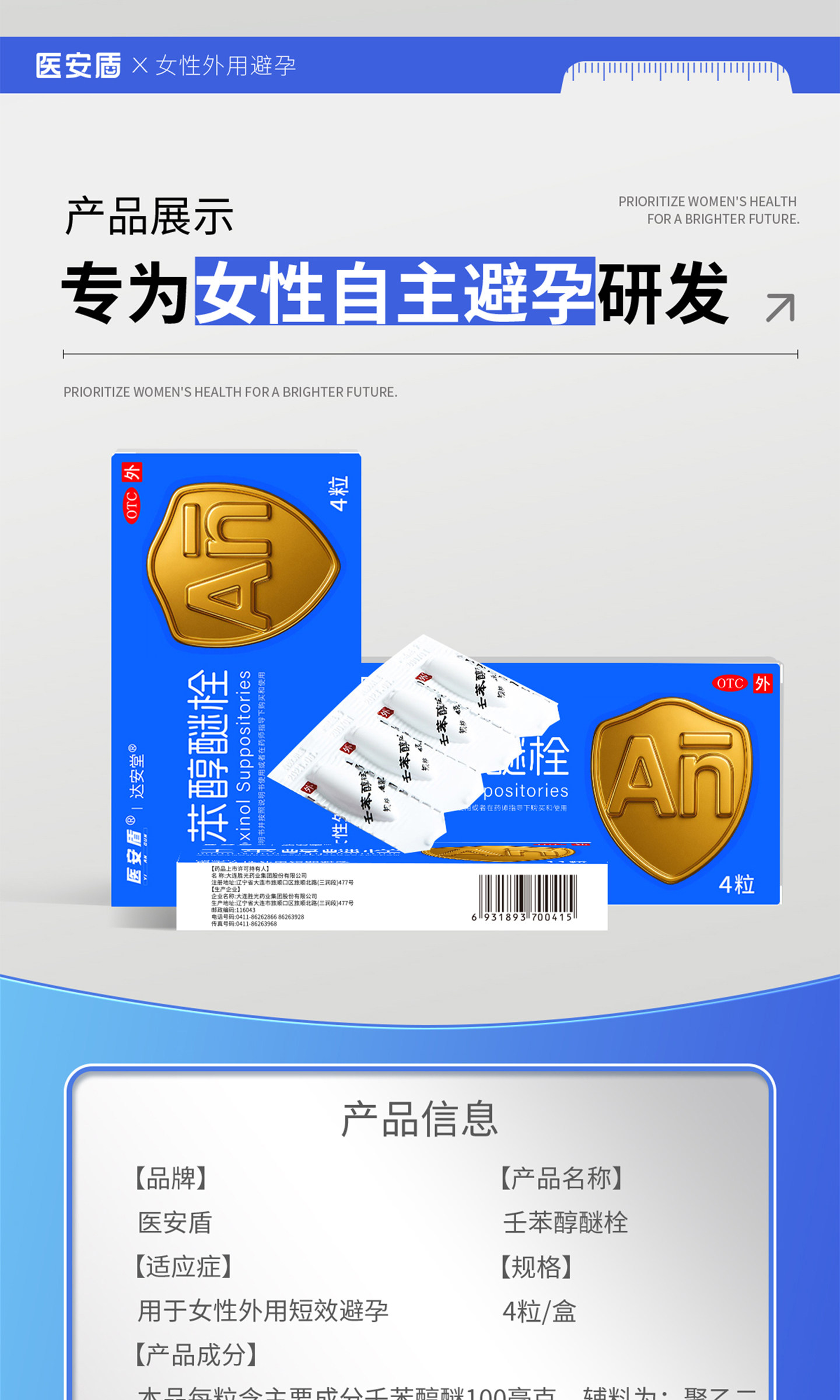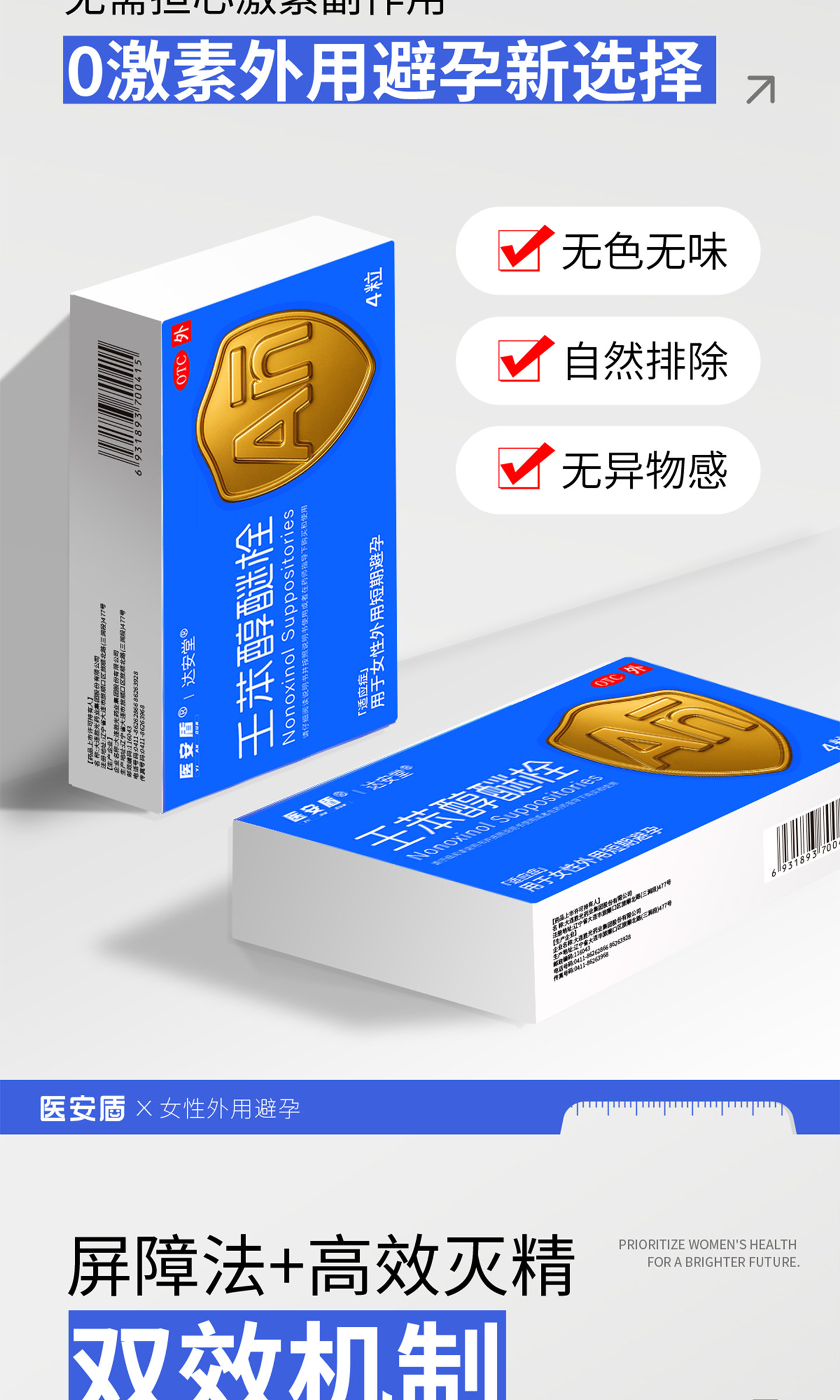 医安盾、壬苯醇醚栓、100mg*4粒、外用避孕药、无套零距离、液体避孕套