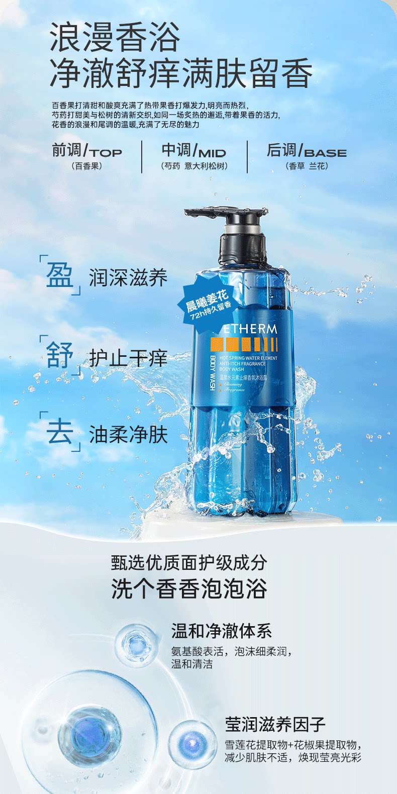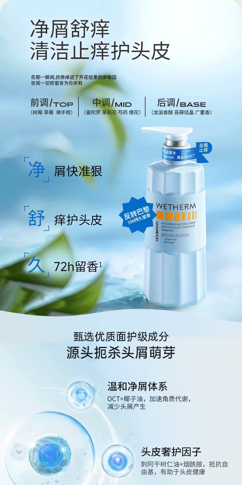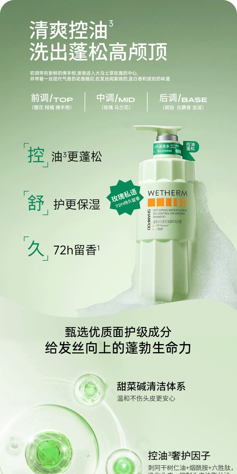 温碧泉水元素止痒香氛沐浴露头发养护72h留香控油蓬松洗发水正品1