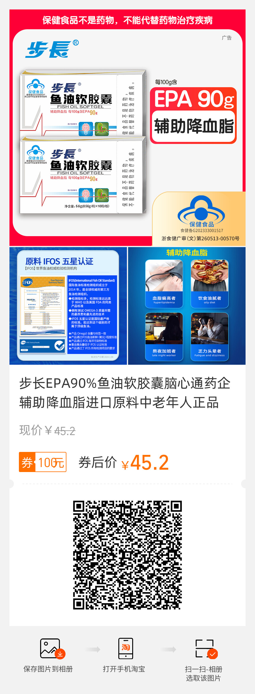 步长、EPA90%鱼油软胶囊、脑心通药企、辅助降血脂、进口原料、中老年人正品