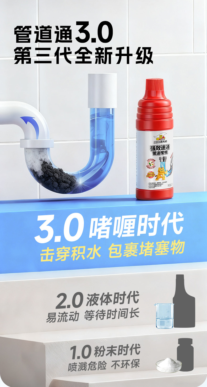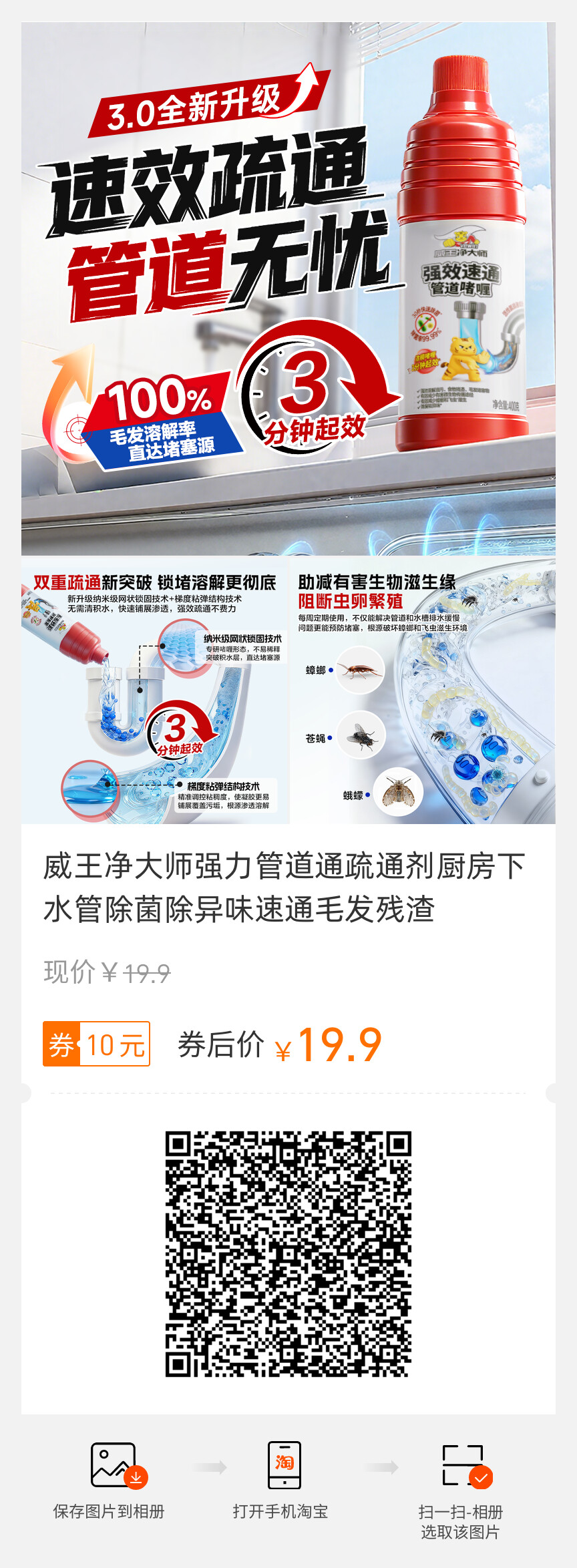 威王净大师、强力管道通、疏通剂、厨房下水管、除菌除异味、速通毛发残渣