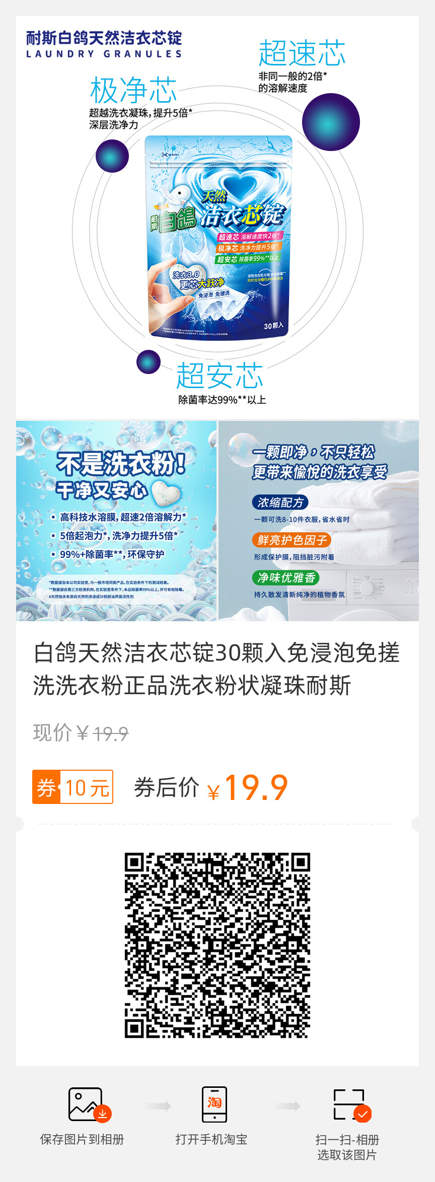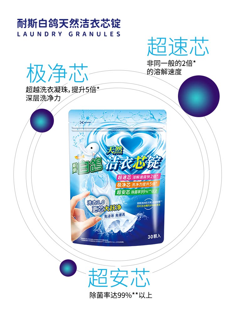 白鸽天然洁衣芯锭30颗入免浸泡免搓洗洗衣粉正品洗衣粉状凝珠耐斯