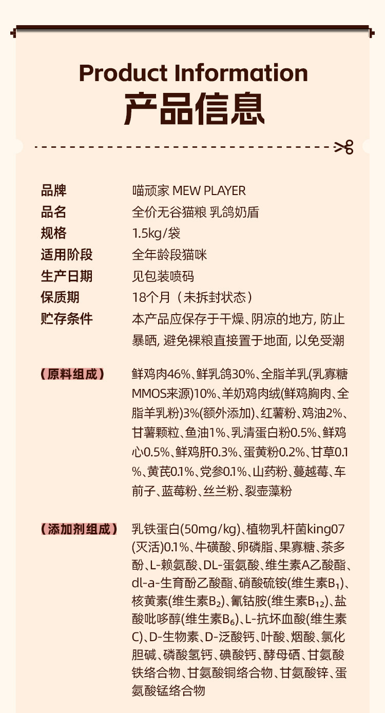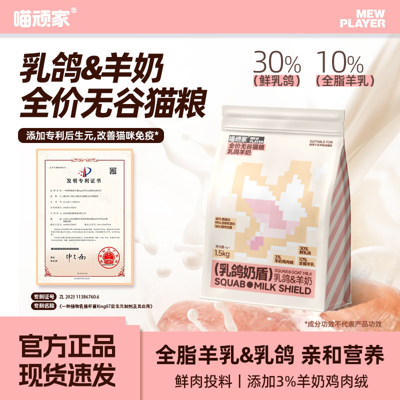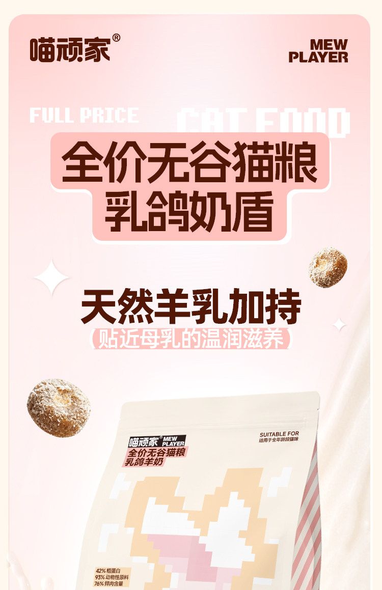 喵顽家、羊奶乳鸽鲜肉猫粮、全价无谷、性价比、营养高蛋白、汉欧款
